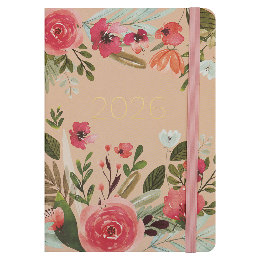 Stylowy kalendarz tygodniowy z kolekcji Paperdot, który łączy funkcjonalność z pięknym designem. Twarda jasnoróżówa okładka zdobiona jest żywymi, kolorowymi kwiatami, które nadają całości lekkości i wiosennego charakteru. Na środku okładki znajduje się złoty napis 2026, który subtelnie podkreśla elegancję całego projektu. Kalendarz posiada różową gumkę, która zabezpiecza wnętrze. Format A5 (139 × 200 mm) sprawia, że kalendarz jest poręczny i wygodny do noszenia w torbie czy plecaku.