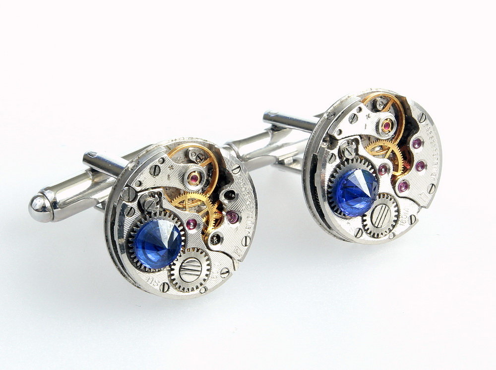 spinki do mankietów wykonane ręcznie surowy mechanizm zegarka ozdobiony kamieniem baza spinek posrebrzana, w kolorze platynowym rozmiar: - średnica: 15 mm - długość uchwytu: 12 mm zapakowane w ...