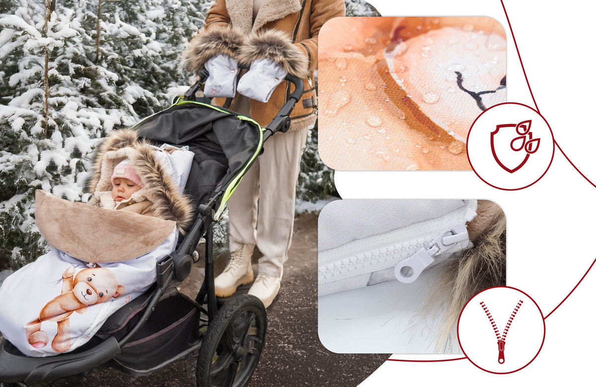 Dzięki swoim unikalnym właściwościom - wodoodporności i wiatroszczelności - śpiworek doskonale chroni przed deszczem i zimnem. Jest uniwersalny, sprawdzi się zarówno w wózku, spacerówce, przyczepce rowerowej, jak i wanience. Łatwy w praniu, zachowuje swój kształt i jest dostępny w różnych rozmiarach, co umożliwia jego indywidualne dopasowanie.