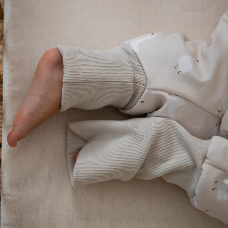 Elastyczne mankiety na nogawkach doskonale dopasowują się do ciała malucha, zapewniając bezpieczne i wygodne noszenie oraz w razie potrzeby zasłonią stópki.