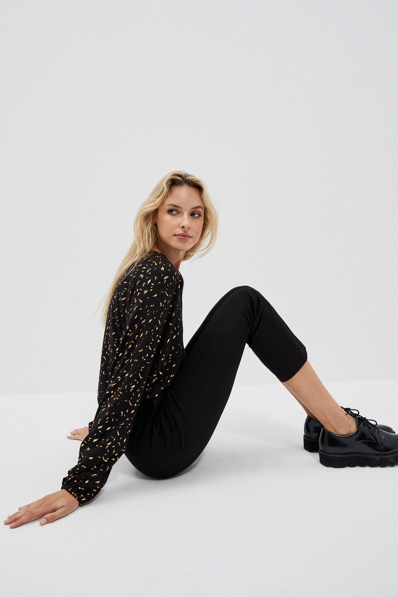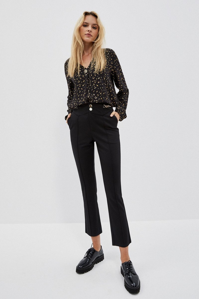 64%WISKOZA, 32%POLIESTER, 4%ELASTAN. Spodnie typu cygaretki uszyte w kolorze głębokiej czerni. Z przodu, po bokach dwa ozdobne złote łańcuszki. Prosty, uniwersalny fason w kant. Długość 7/8. Z przodu