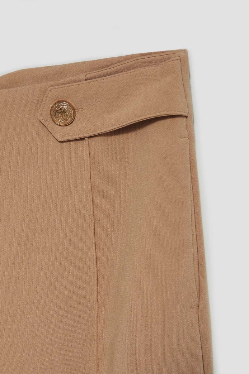 66%POLIESTER, 28%WISKOZA, 6%ELASTAN. Spodnie w kolorze beżowym wykonane z wysokiej jakości poliestru, zapewniają trwałość i łatwość w utrzymaniu czystości. Ozdobne guziki dodają im elegancji, a wykończenie w kant dodaje im wyjątkowego charakteru. Szerokie nogawki sprawiają, że spodnie świetnie układają się na sylwetce, jednocześnie podkreślając jej kobiece kształty. Długość 7/8 nadaje im nowoczesny wygląd, a zamek ułatwia ich zakładanie.