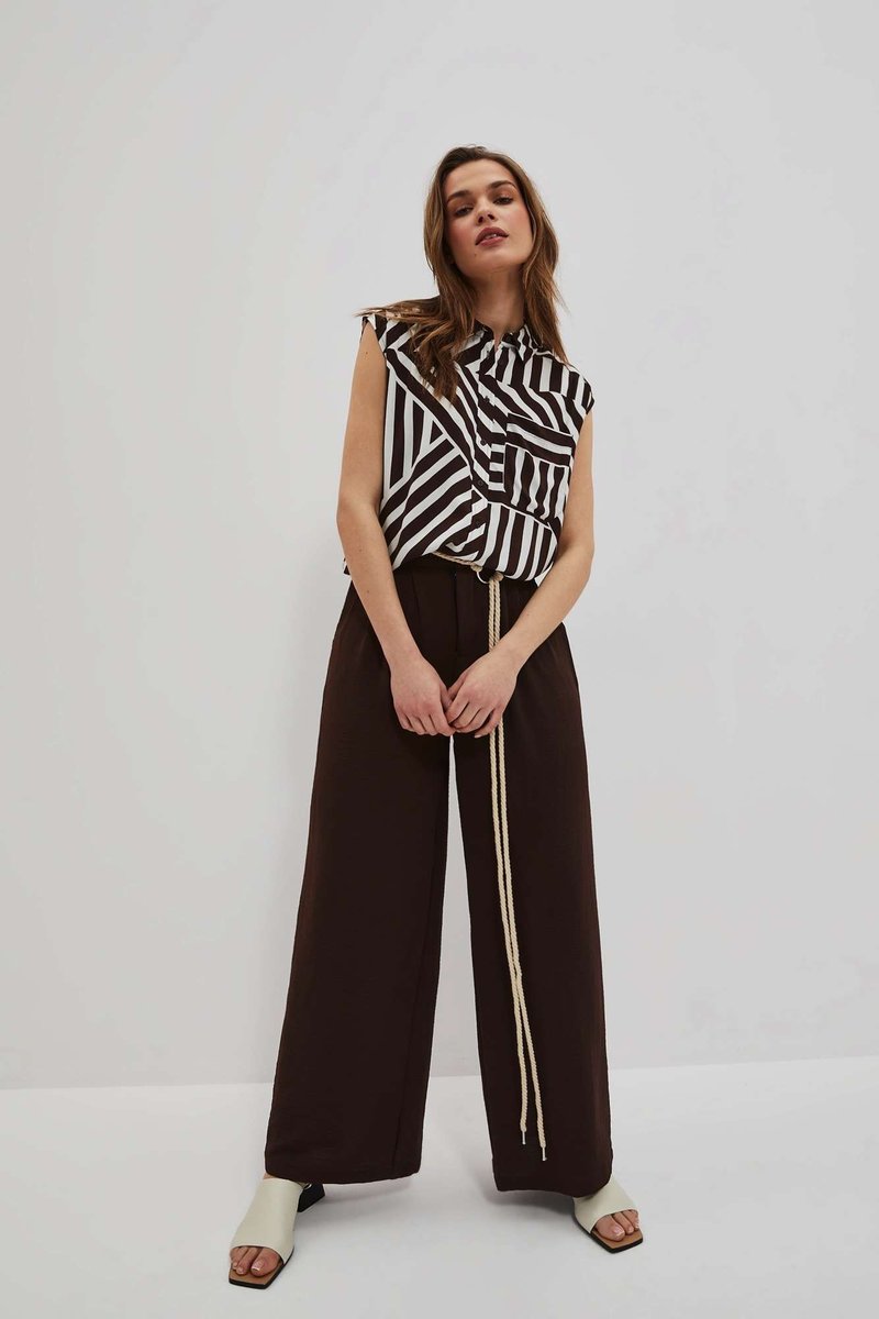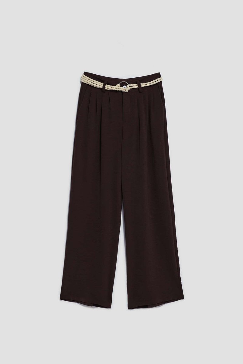 100%POLIESTER Spodnie damskie w kolorze ciemnego brązu. Gładkie, bez dodatkowych wzorów. Wysoki stan, bardzo komfortowy w noszeniu. Zapinane na guzik oraz zamek. Spodnie dodatkowo posiadają szlufki i pasek w formie białego sznurka. Z przodu zaszewki materiału. Po bokach kieszenie. Długie i szerokie nogawki. Wykonane z miłego materiały. Bardzo komfortowe w noszeniu a zaraz modne. Oryginalny model dla kobiet lubiących niebanalny styl.