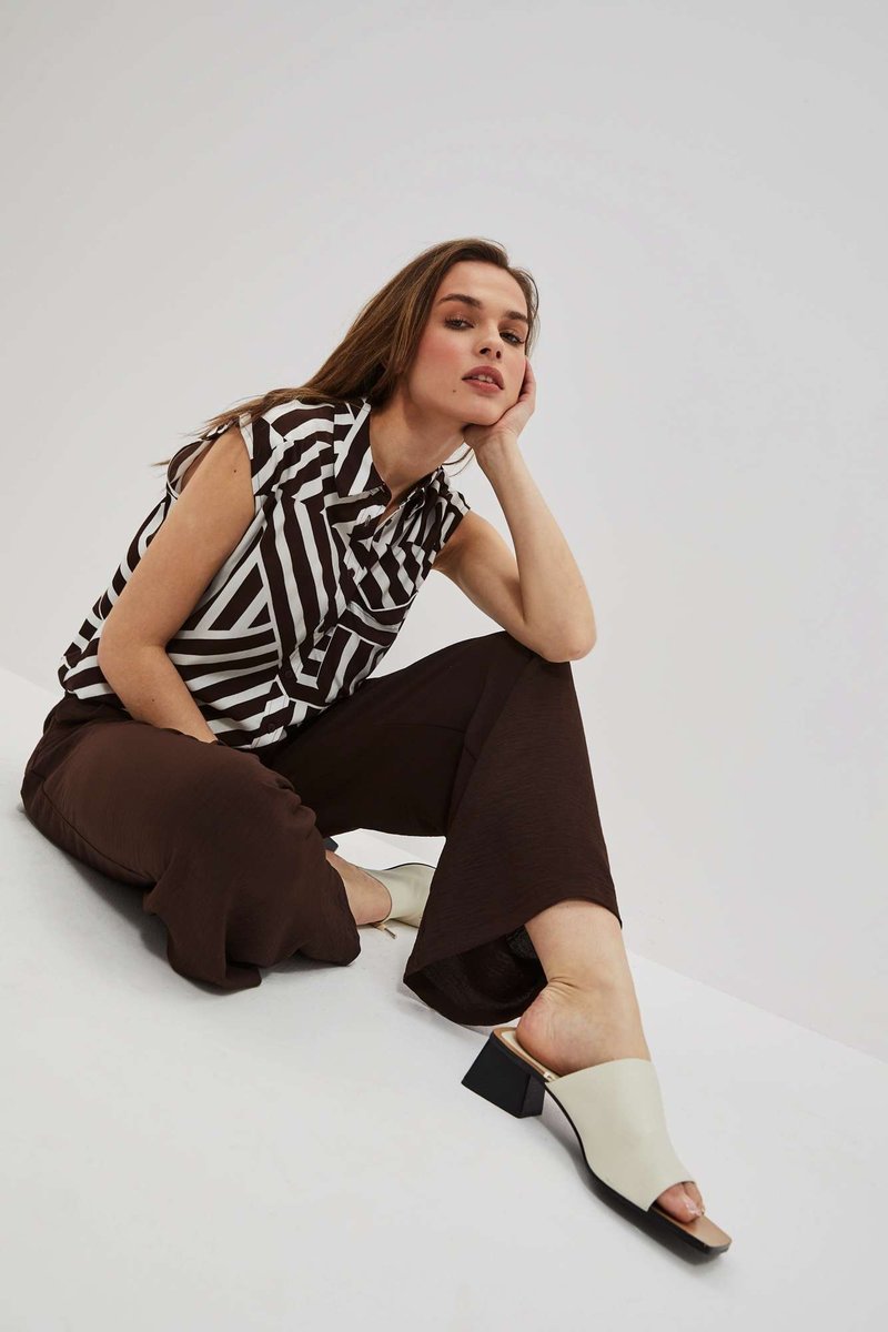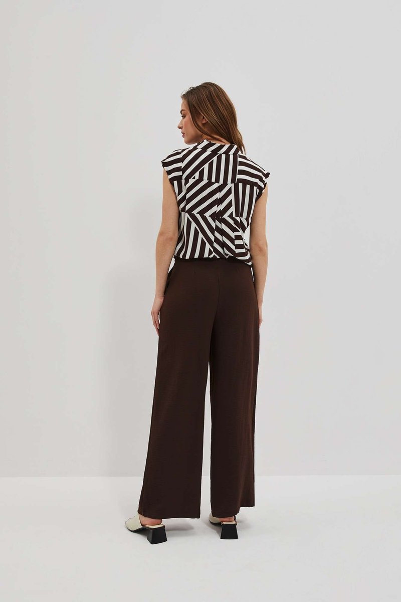 100%POLIESTER Spodnie damskie w kolorze ciemnego brązu. Gładkie, bez dodatkowych wzorów. Wysoki stan, bardzo komfortowy w noszeniu. Zapinane na guzik oraz zamek. Spodnie dodatkowo posiadają szlufki i