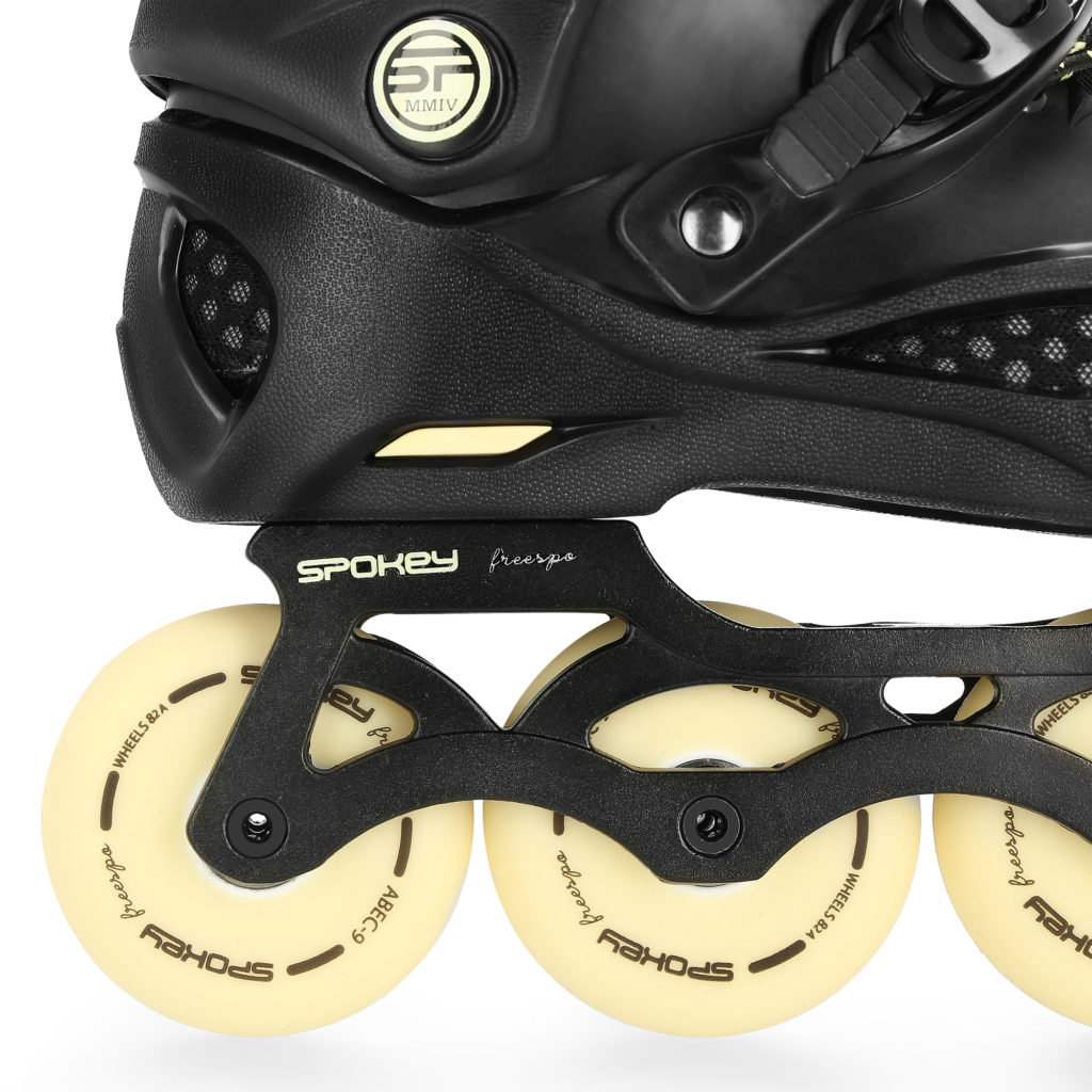 Rolki Spokey FREESPO to połączenie komfortu jazdy oraz najlepszych parametrów technicznych. Zastosowanie twardej skorupy, wykonanej z PP* (wysoce elastyczny polipropylen), zapinanej na dwie klamry (górną klasyczną oraz dolną z pompką zaciskową) oraz sznurowadła, zapewnia optymalne dopasowanie buta do stopy. Zmniejsza to ryzyko doznania kontuzji i jednocześnie umożliwia perfekcyjne kontrolowanie manewrów i skrętów podczas jazdy. Konstrukcja Freespo niweluje także błędy, które często pojawiają się u początkujących skaterów, takie jak np. koślawienie kostek.