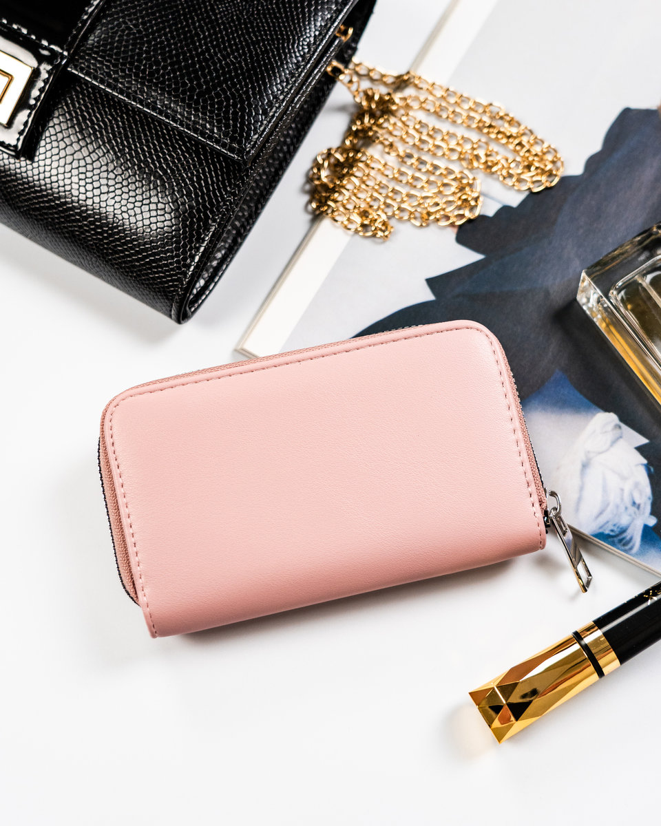 Portfel zamykany jest na solidny zamek błyskawiczny, który gwarantuje, że wszystkie przechowywane w nim przedmioty będą bezpieczne i łatwo dostępne.