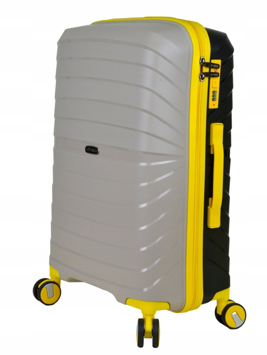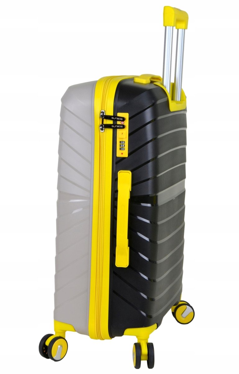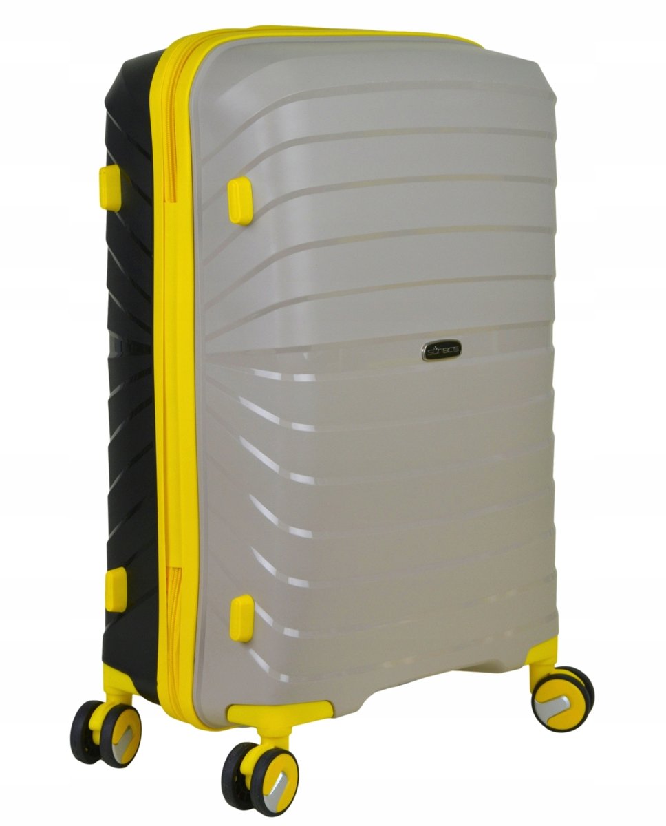 Wyjątkowa walizka z polipropylenu to esencja nowoczesnego designu i funkcjonalności. Jej czarny korpus o subtelnym połysku zdobią dynamiczne, faliste tłoczenia, które przywołują na myśl futurystyczną elegancję. Energetyczne, żółte akcenty – uchwyty, kółka i obramowanie zamka – nadają jej wyrazistego charakteru, jakby pochodziła prosto z futurystycznego filmu science fiction.