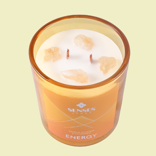 Świeca Sojowa Energy z zatopionym kamieniem Cytrynu to połączenie świeżości cytrusowych aromatów i szałwii z delikatnością naturalnego kamienia. Jej subtelny blask i aromatyczny zapach rozbrzmiewa w harmonii z kamieniem Cytrynu, tworząc wyjątkowy moment relaksu i pobudzenia. Świeca Senses story to doskonały pomysł na prezent dla siebie lub bliskiej osoby. Świeca jest w szklanym opakowaniu z wieczkiem.