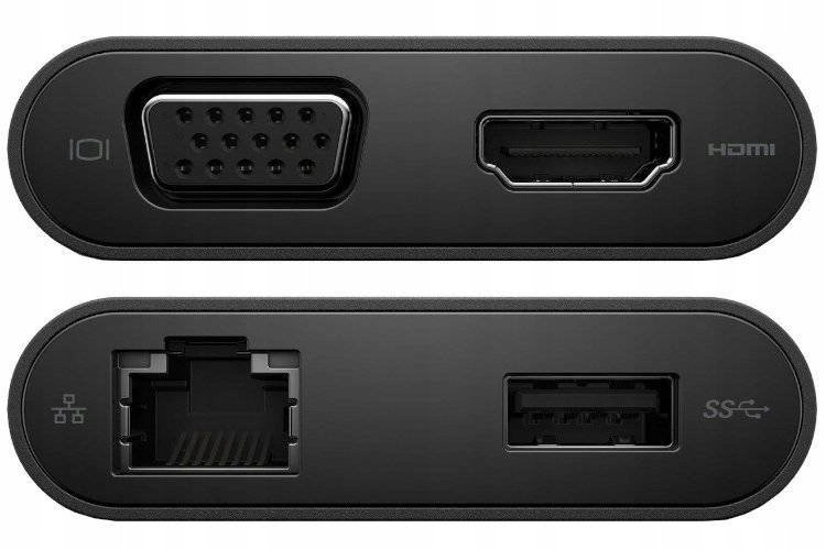 Adapter Dell — z USB-C do HDMI/VGA/Ethernet/USB 3.0 umożliwia w razie potrzeby podłączenie do sieci przewodowych za pośrednictwem portu Ethernet. Dzięki temu można nawiązać połączenie z Internetem i pracować wydajnie w niemal każdym środowisku.
