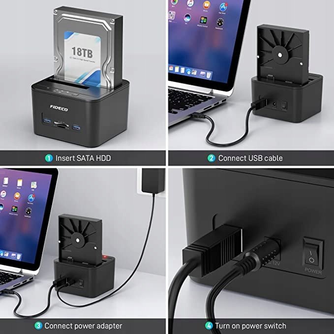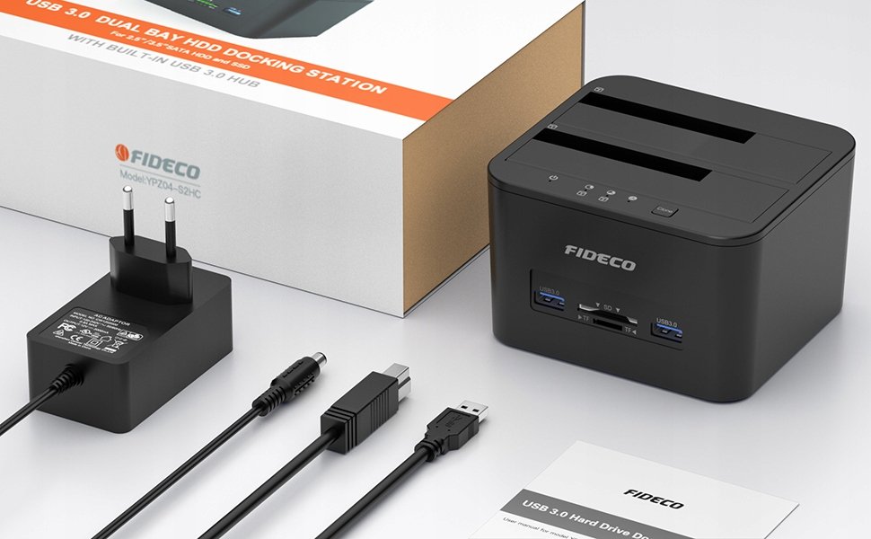 Stacja dokująca do dysków twardych FIDECO jest kompatybilna z 2,5- i 3,5-calowymi dyskami twardymi/SSD SATA.
