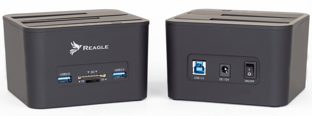 Reagle to stacja dokująca dla dwóch dysków HDD i SDD z czytnikiem kart oraz