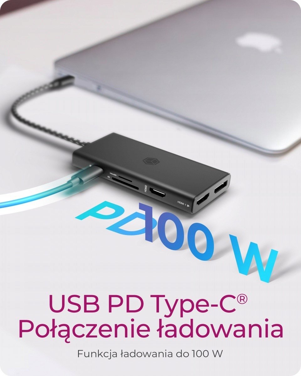 7 w 1Stacja dokująca USB Type-C z potrójnym wyjściem wideo IB-DK4011-CPDDobre połączenie: Odporne na skręcanie złącze USB typu C łączy stację dokującą i notebook jak we snie i oferuje niewiarygodną wszechstronność: przesyłanie danych, wyjście wideo i zasilanie przez jedno złączeWzornictwo i wydajność: Stylowy wygląd, najnowsza technologia. Kompaktowa aluminiowa obudowa umożliwia wygodny dostęp do najważniejszych portów rozszerzeń, zapewniając jednocześnie dobre odprowadzanie ciepłaPoszerz swoje horyzonty: Łatwa wielozadaniowość: Lepsza widoczność szczegółów dzięki połączeniu wielu monitorów. Dzięki potrójnej łączności wideo korzystanie z wielu monitorów nigdy nie było łatwiejszeDostarczanie zasilania: Ta technologia ładowania przez port Type-C umożliwia ładowanie podłączonego i obsługiwanego notebooka z mocą do 100 watów, pod warunkiem podłączenia istniejącego zasilacza USB PD Type-C do stacji dokującejTowarzysz podróży: Dzięki kompaktowej konstrukcji ta mała stacja dokująca mieści się w każdej kieszeni. Eleganckie aluminium sprawia, że jest to solidne urządzenie do podróży, z odpowiednim złączem do notebooka zawsze pod ręką