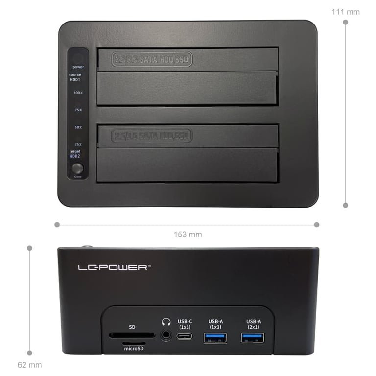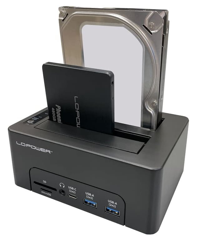 LC-Power LC-DOCK-C-MULTI-HUB. Typ nośników pamięci: HDD, Karta pamięci, SSD, Interfejs napędów pamięci masowej: SATA, druga generacja szeregowej magistrali komputerowej (serial ATA II), Serial ATA III, Obsługiwane rozmiary dysków pamięci: 2.5,3.5". Interfejs hosta: USB 3.2 Gen 2 (3.1 Gen 2) Type-C. Kolor produktu: Czarny, Materiały: Plastik, Maksymalna szybkość przesyłania danych: 10 Gbit/s. Szerokość produktu: 153 mm, Głębokość produktu: 11 mm, Wysokość produktu: 62 mm. Szerokość opakowania: 202 mm, Głębokość opakowania: 161 mm, Wysokość opakowania: 73 mm