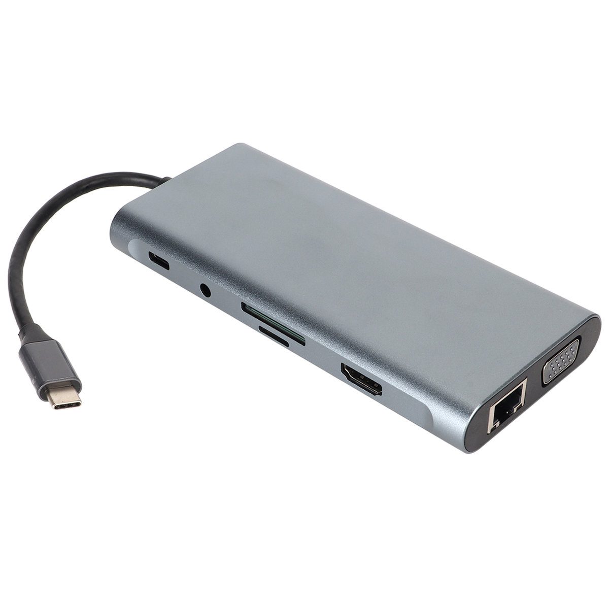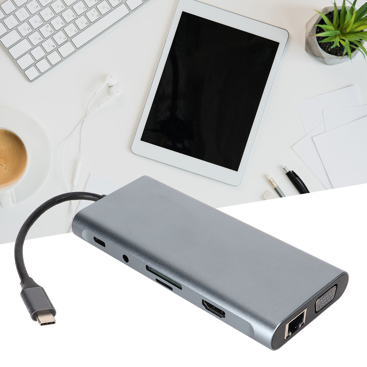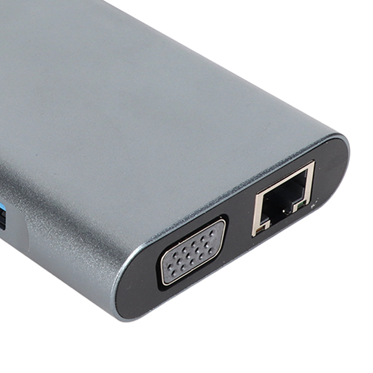 1. Projekt 11 w 1: Ten hub USB C oferuje 4 x porty USB 3.0, 1 x port ładowania PD, 1 x interfejs multimedialny 4K HD, 1 x interfejs VGA, 1 x port Ethernet RJ45, 1 x port audio 3,5 mm, gniazdo na kartę pamięci i gniazdo na kartę magazynującą.
