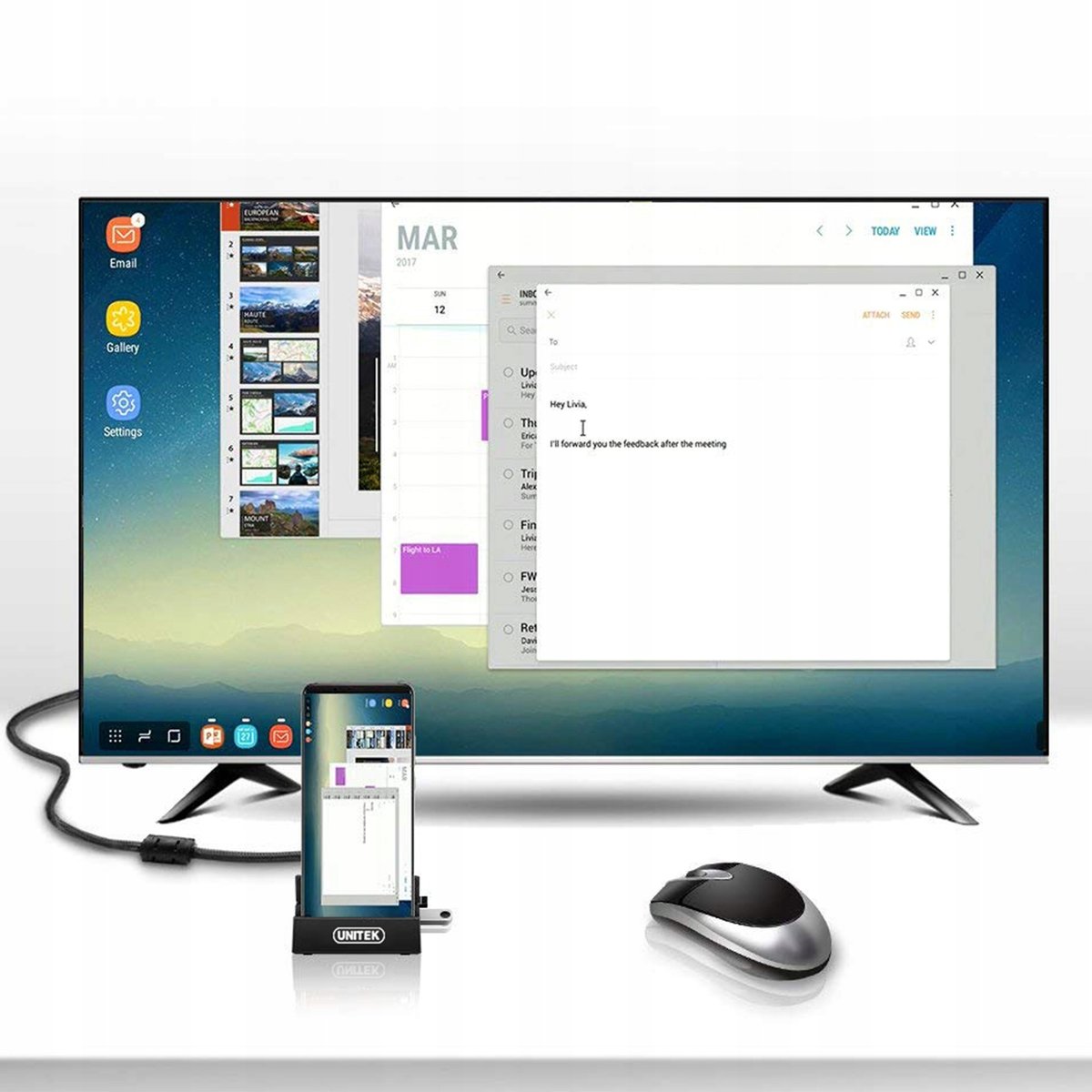 - Współpracuje z DeX Station Samsung S8, S9 Note 8 oraz pulpitem EMUI dla HUAWEI Mate10 P20 / P20 PRO,