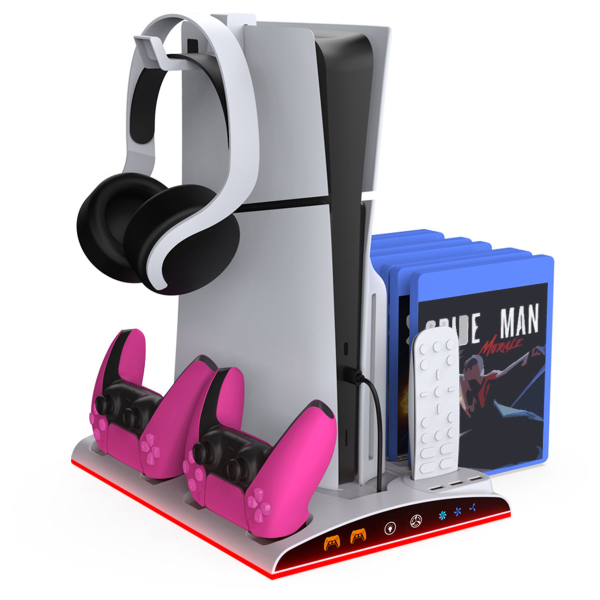 Stojak chłodzący PS5 wyróżnia się eleganckim designem, który idealnie komponuje się z Twoją konsolą, czyniąc go niezbędnym elementem dla każdego gracza. Wbudowany kabel typu C zapewnia zasilanie bezpośrednio z konsoli PS5, eliminując potrzebę dodatkowych kabli. Trzy porty USB, w tym jeden z funkcją przesyłu danych, zwiększają funkcjonalność urządzenia, umożliwiając ładowanie innych urządzeń. Subtelne, ale żywe oświetlenie RGB po bokach dodaje estetyki Twojemu stanowisku gamingowemu, tworząc dynamiczną atmosferę.