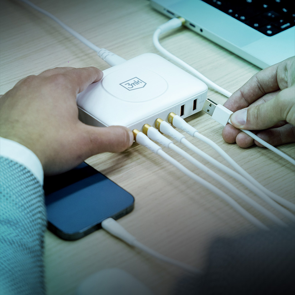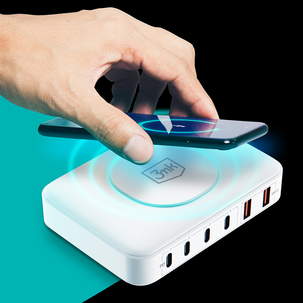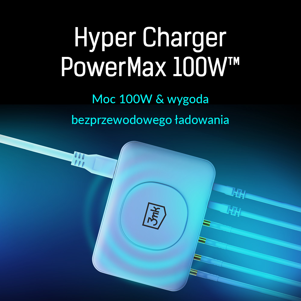 Masz nowoczesnego smartfona z ładowaniem indukcyjnym, którego wciąż ładujesz za pomocą kabla USB, żeby było szybciej? Czas zastąpić wszystkie ładowarki jedną - Hyper Charger PowerMax 100W ™, która pozwala wykorzystać potencjał urządzeń premium. Ładuje bezprzewodowo z mocą do 15W, więc nie czekasz godzinami na powrót energii. Odkładasz telefon czy zegarek na ładowarkę i po krótkim czasie masz pełną baterię. Wygodnie, prawda? Jednocześnie możesz ładować kablami pozostałe urządzenia.