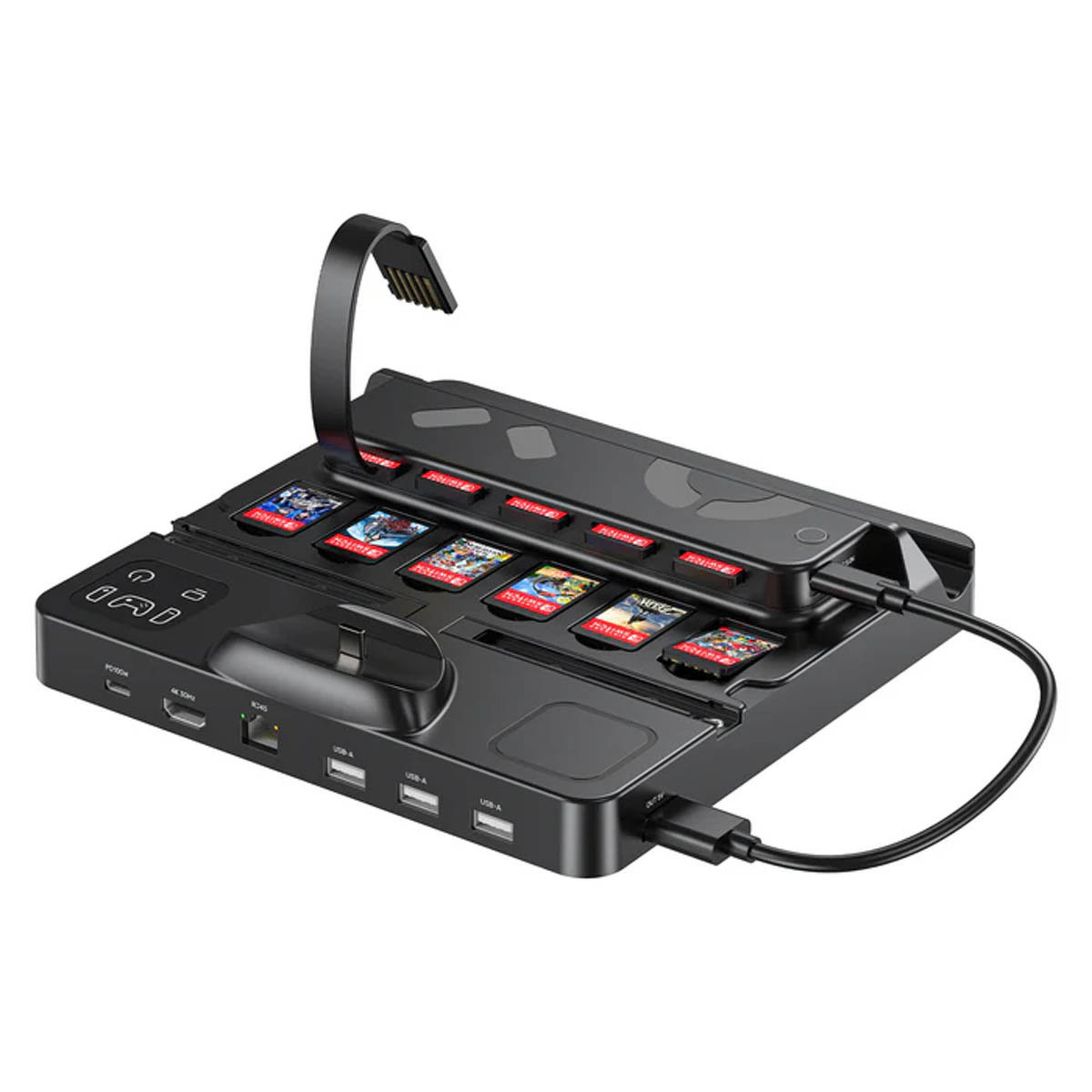 Dzięki swojej niewielkiej konstrukcji stacja nie zajmuje dużo miejsca, ale pomieści wszystko, co potrzebne do codziennego grania. Możesz ją postawić przy telewizorze, na biurku lub w torbie i zabrać do znajomych. Wszystkie elementy - od portów po uchwyty na gry - zostały zaprojektowane z myślą o maksymalnym komforcie użytkowania. To urządzenie, które dobrze wygląda i dobrze działa.