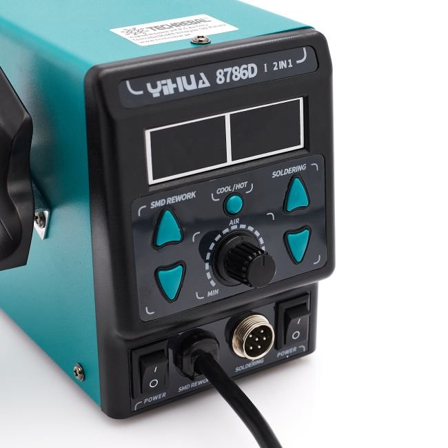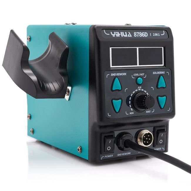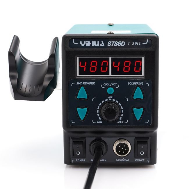Stacja lutownicza 2w1 Yihua 8786D-I✅ 2w1 - Hot-Air i kolbowa✅ Dwa wyświetlacze✅ Nowoczesna elektronika w środku✅ System chłodzenia kolby Hot-Air✅ Funkcja Sleep⚡ Moc 740W✅ Szybkie ...
