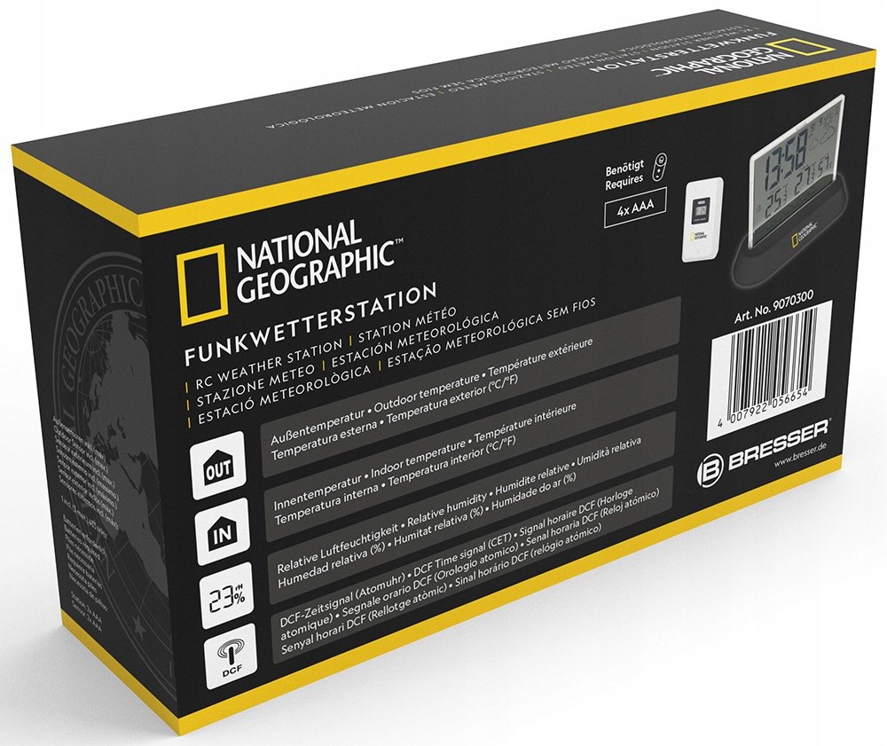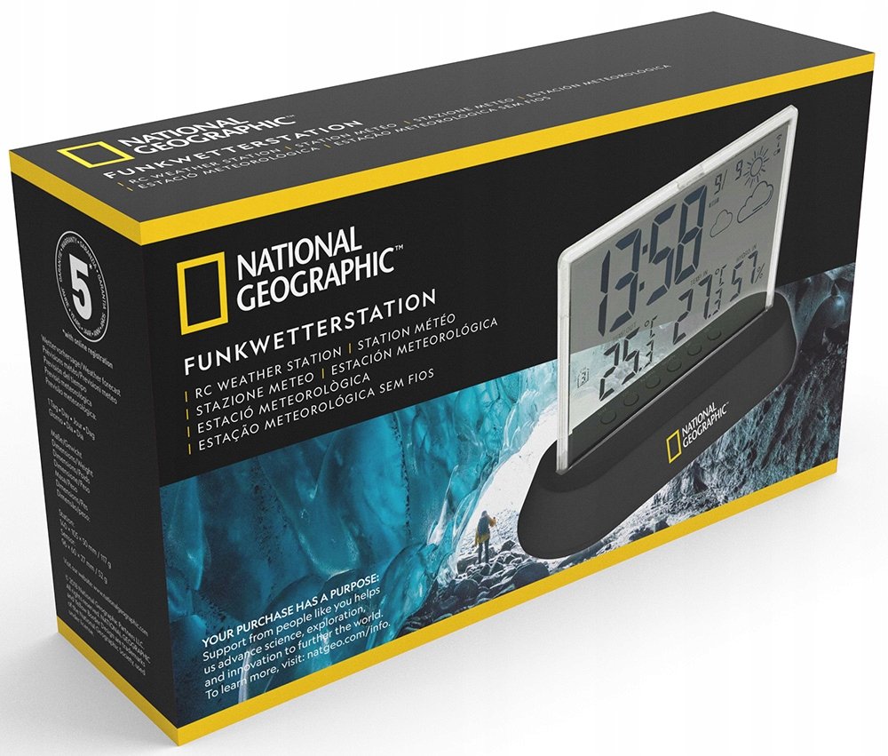 Przeźroczysta bezprzewodowa stacja meteorologiczna Bresser National Geographic łączy w sobie duże cyfry na futurystycznie przejrzystym wyświetlaczu z prostą i elegancką podstawą. Elementy obsługowe zostały umieszczone z tyłu, dając oszczędną konstrukcję. Dzięki przezroczystemu wyświetlaczowi można je nadal wyraźnie odczytywać. Oprócz dużych cyfr godzin wyświetlacz pokazuje również temperaturę zewnętrzną i wewnętrzną oraz wilgotność względną obok siebie. Prawdziwa atrakcja na każdym biurku. Stacja meteorologiczna może być również używana jako budzik i jest wyposażona w funkcję drzemki.