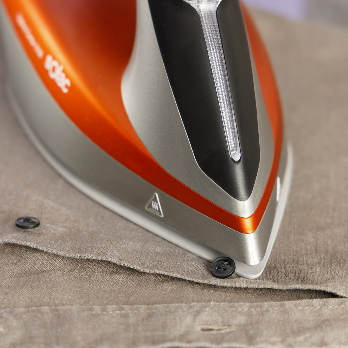 Wyjmowany zbiornik 1,5 L oraz system Infinity pozwalają na uzupełnianie wody bez przerywania prasowania. Zasięg pracy 3,65 m i przednie oświetlenie zapewniają swobodę ruchu i doskonałą widoczność zagnieceń, nawet w trudno dostępnych miejscach.