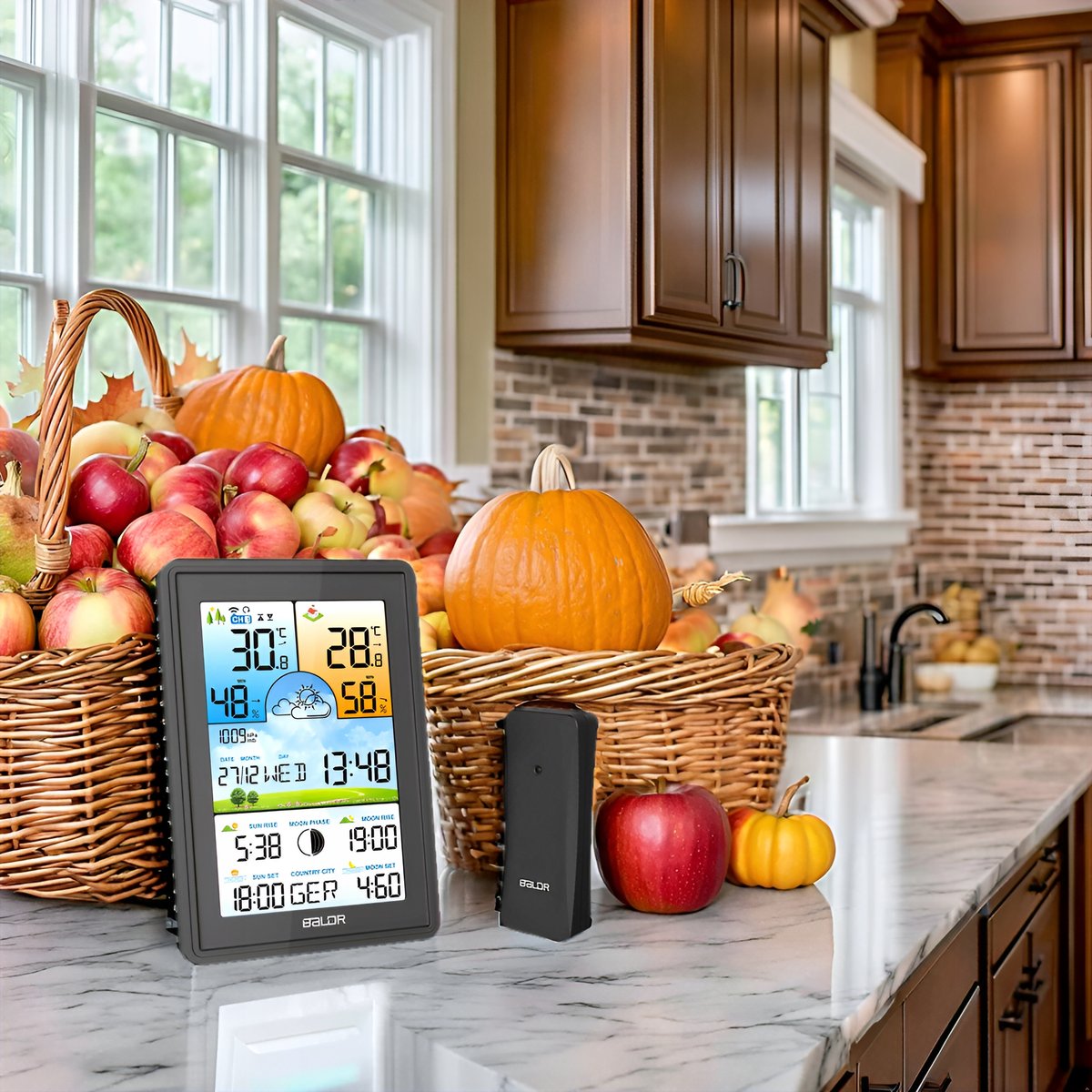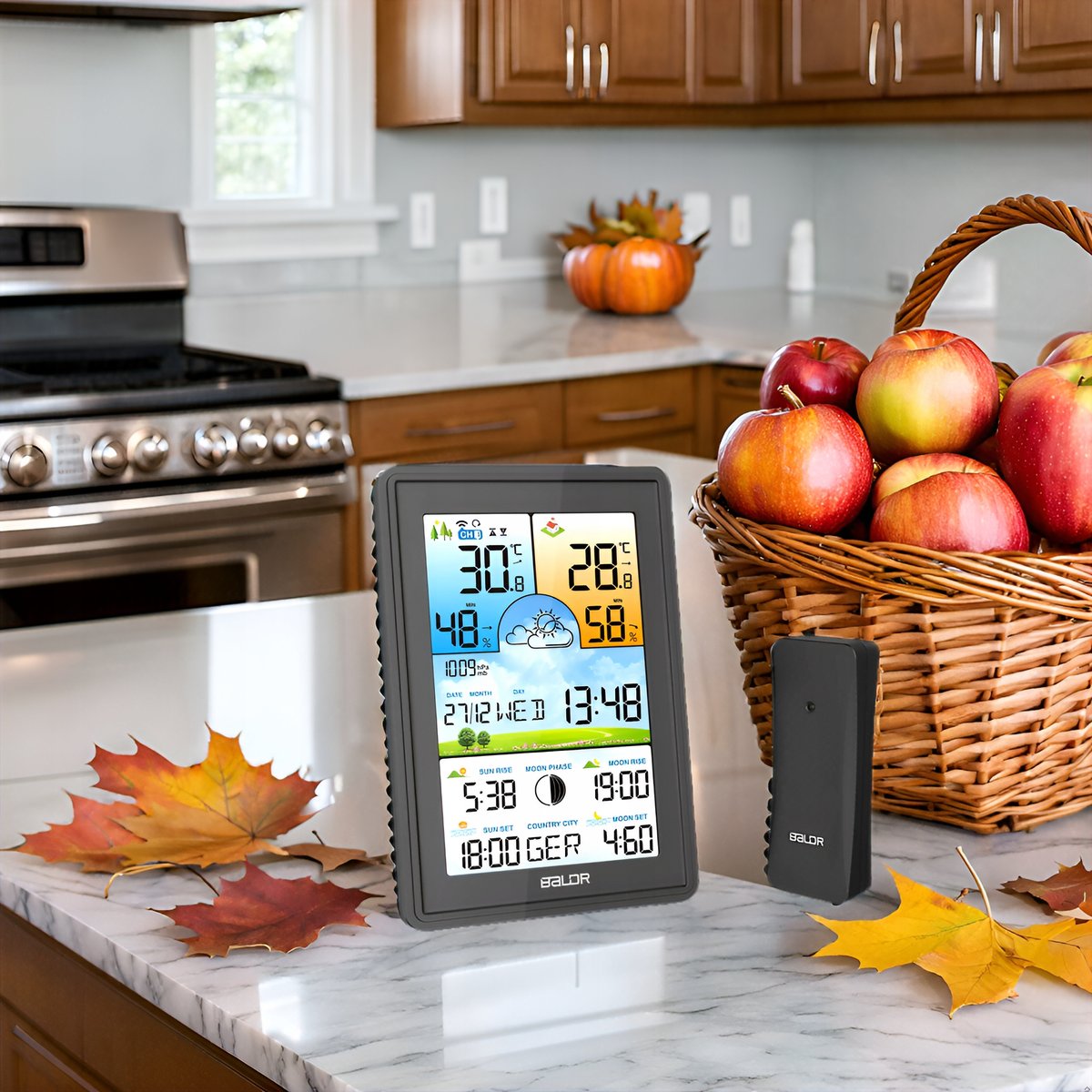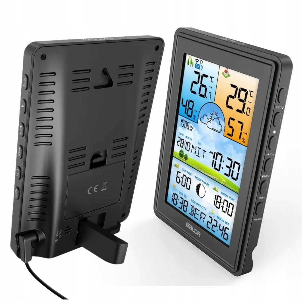 Rozpocznij każdy dzień z pełną kontrolą nad prognozą pogody dzięki naszej bezprzewodowej stacji pogodowej BALDR. Ten elegancki model z kolorowym wyświetlaczem LCD to idealne rozwiązanie zarówno do użytku wewnętrznego, jak i zewnętrznego. Zyskaj dostęp do najnowszych informacji o temperaturze, wilgotności oraz ciśnieniu atmosferycznym i planuj swoje aktywności bez obaw o niespodziewane zmiany pogody.
