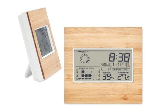 zawiera zegar, termometr, wskaźnik wilgotności i kalendarzfront wykonany z bambusa (bambus jest materiałem naturalnym, więc kolor może się różnić w zależności od produktu)tył wykonany z plastiku ABS ...