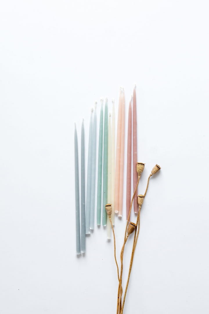 Zestaw ekologicznych, ręcznie robionych smukłych świeczek w rozmiarze standard w pastelowym miksie.