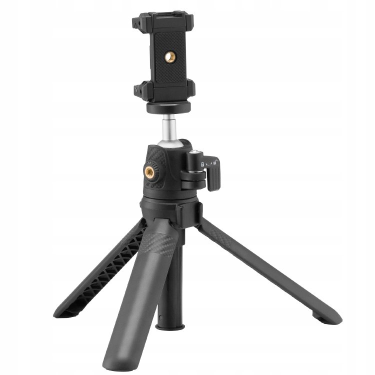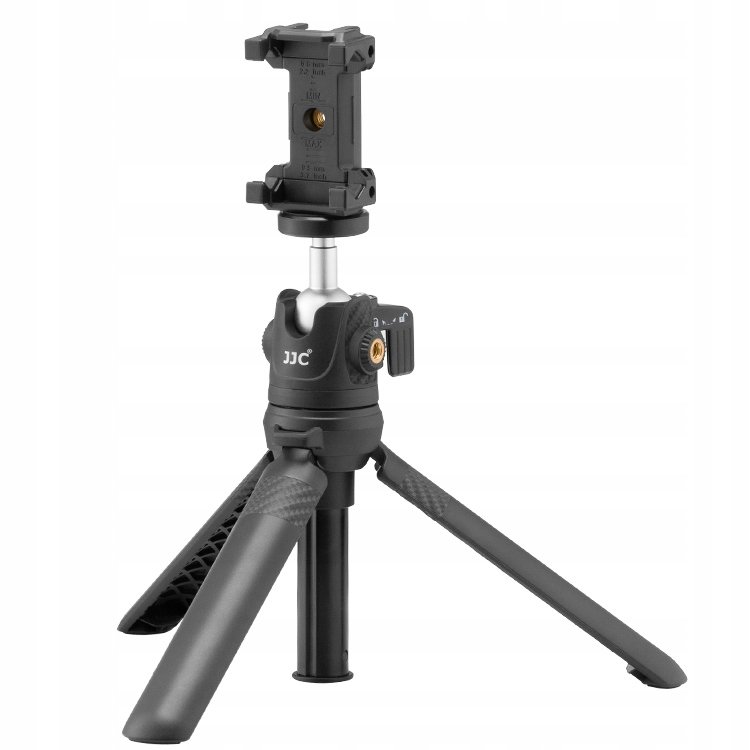 JJC TP-ET-1 to statyw przeznaczony przede wszystkim do małych kamer i smartfonów do nagrywania vlogów, streamów i robienia filmów w social mediach. Statyw wyposażony jest w głowicę kulową z gwintem 1/4", którą można zablokować w szybki i łatwy sposób przy pomocy przesuwanej blokady. W komplecie znajdziemy również uchwyt / szczęki sprężynowe, które po wkręceniu w głowicę pozwolą nam na wygodne i szybkie zainstalowanie smartfona o szerokości w zakresie 56-95mm.