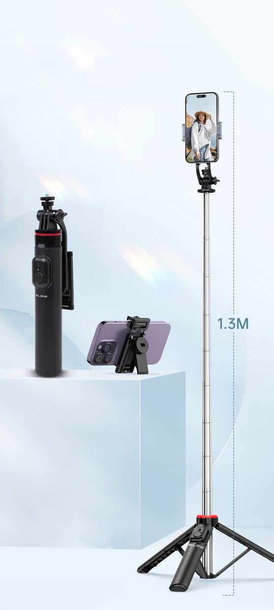 Wyposażony w teleskopowy mechanizm, który umożliwia płynne rozsuwanie, osiągając maksymalną długość 132,5 cm. Dzięki temu można uchwycić szersze kadry, idealne do zdjęć grupowych lub ujęć z większej odległości. Dodatkowa długość zapewnia większą elastyczność podczas robienia zdjęć i nagrywania filmów.