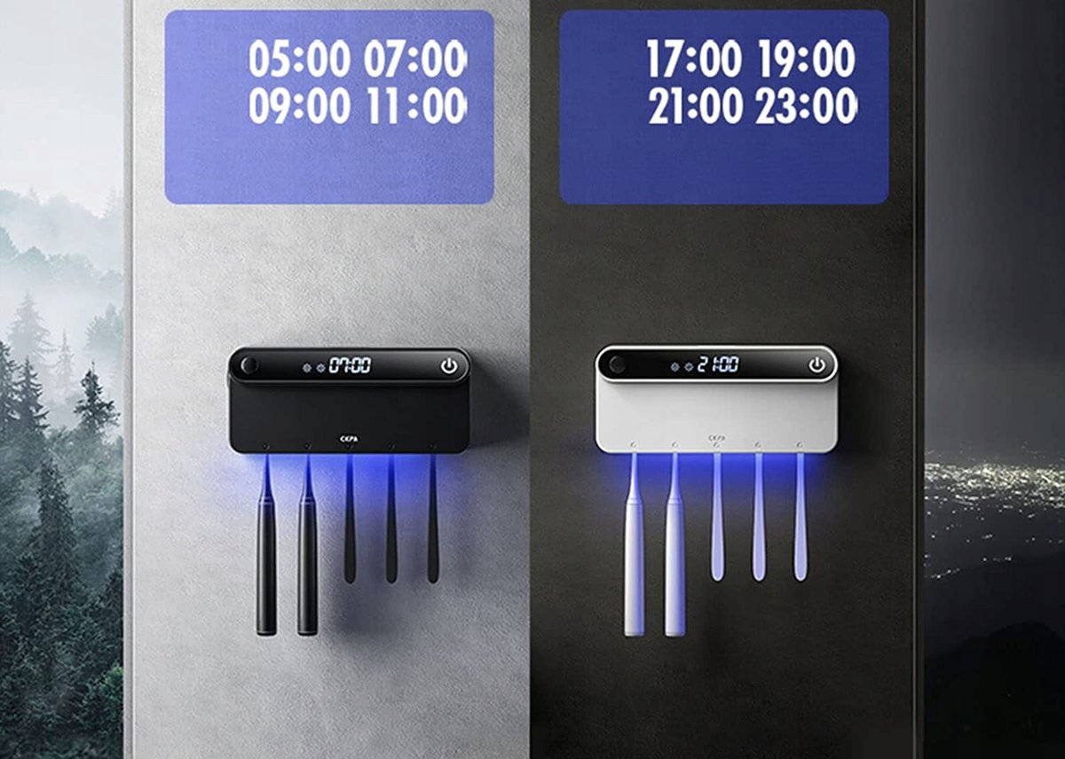 Wyposażona w zintegrowany wentylator, utrzymuje szczoteczkę do zębów w czystości. Zamknięta struktura, bez pleśni i rdzy. Nadaje się do wilgotnych miejsc, takich jak prysznic i łazienka. System pracy po 3 min sterylizacji + 30 minutach suszenia i automatyczne wyłączanie. Może być również sterowany za pomocą przełącznika dotykowego.