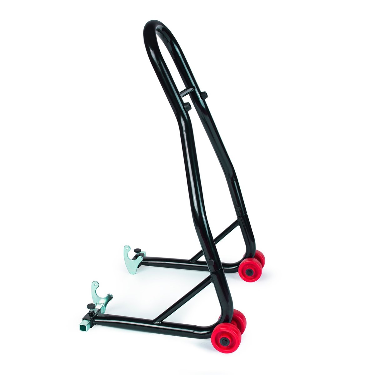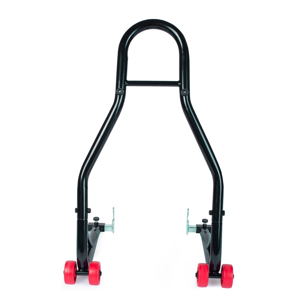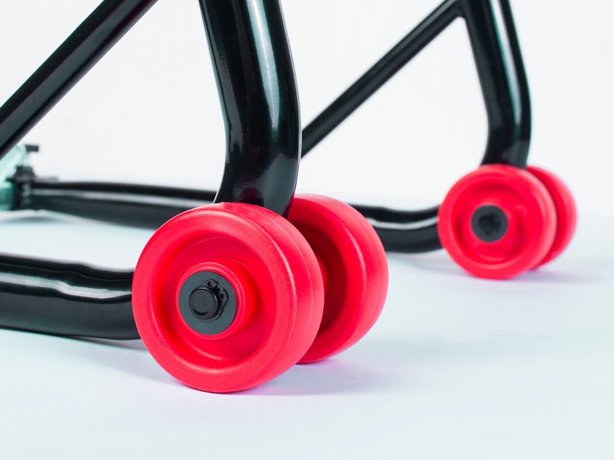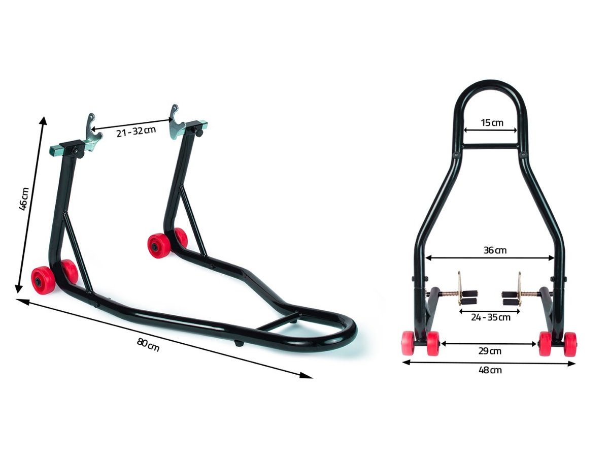 Stojak posiada regulowane adaptery. Wysokość tego modelu to 46 cm, a długość 80 cm. Doskonale sprawdzi się w niewielkich pomieszczeniach, w których liczy się każdy kawałek przestrzeni. Wyposażony jest w podwójne, dodatkowo wzmocnione koła. To doskonały sposób na przechowanie motocyklu lub prace serwisowe! Zestaw obejmuje dwie sztuki.