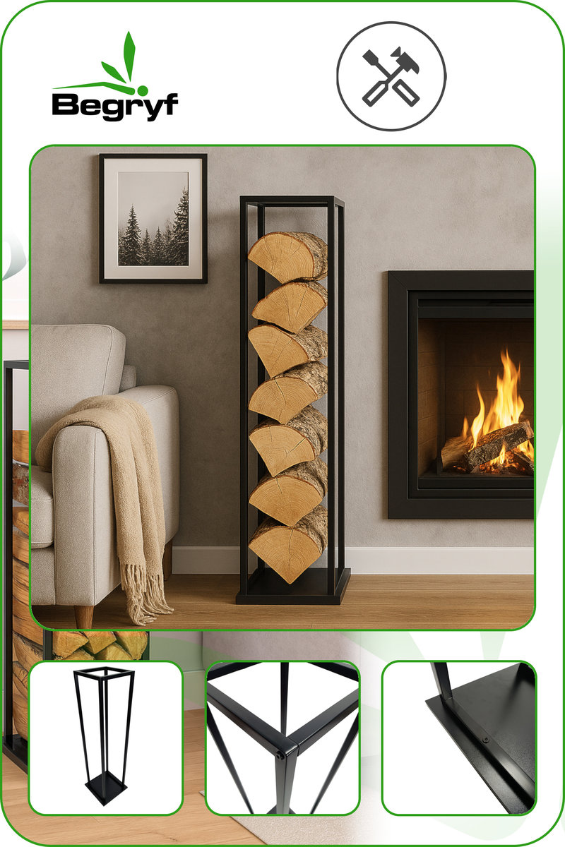 Stojak na drewno kominkowe metalowy czarny pionowy regał na opał loftowy do kominka i salonu 112x33x33 cm | BEGRYF Bardzo solidny produkt - sprawdź! ❤️ Pionowy stojak na drewno kominkowe - styl ...