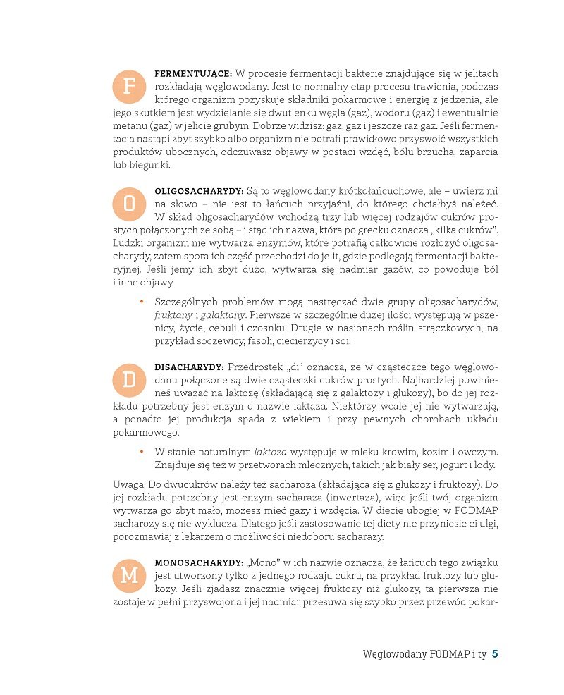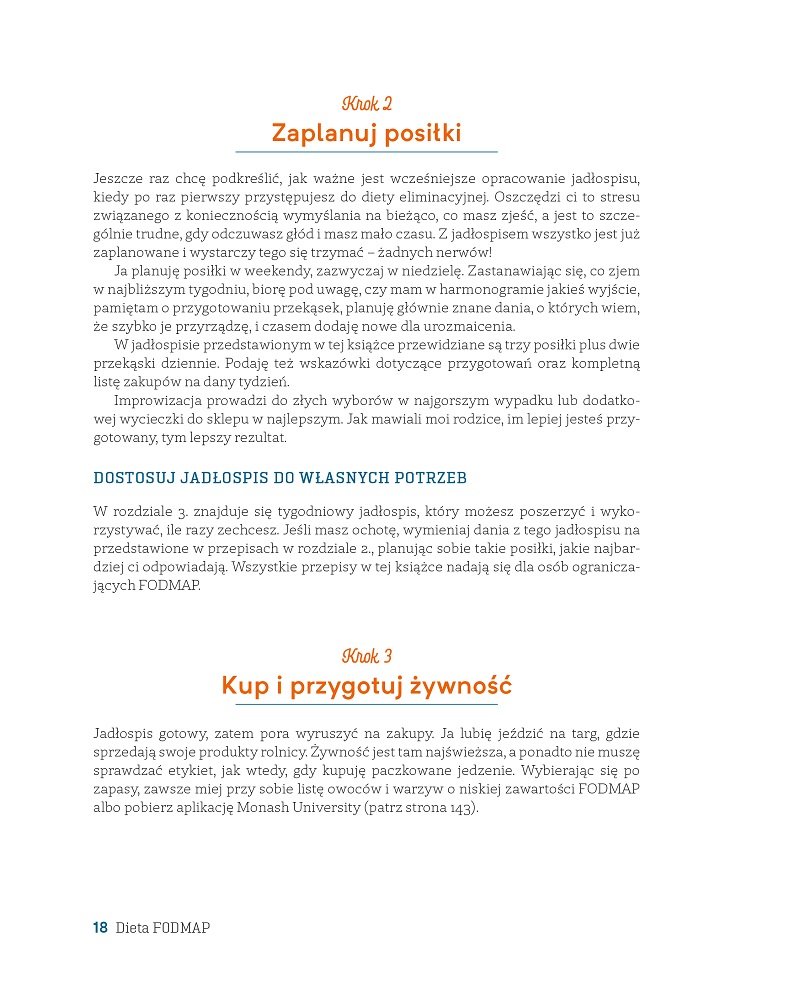 Dieta FODMAP to łatwy program żywieniowy dla osób z zespołem jelita drażliwego, oraz innymi chorobami układu pokarmowego, który polega na ograniczeniu spożycia węglowodanów FODMAP (fermentable oligo-, di-, mono-saccharides and polyols ‒ fermentujące oligo-, di- i monosacharydy oraz poliole). Pozwala ona zapanować nad chorobą i szybko wyeliminować dokuczliwe objawy, a przy okazji schudnąć i poprawić ogólny stan zdrowia. Książka zawiera wszystkie niezbędne informacje na temat tej coraz popularniejszej diety, i jej wpływu na organizm człowieka. Autorka proponuje także plan zakupów oraz 75 smacznych i prostych w przygotowaniu przepisów, także wegańskich wegetariańskich.