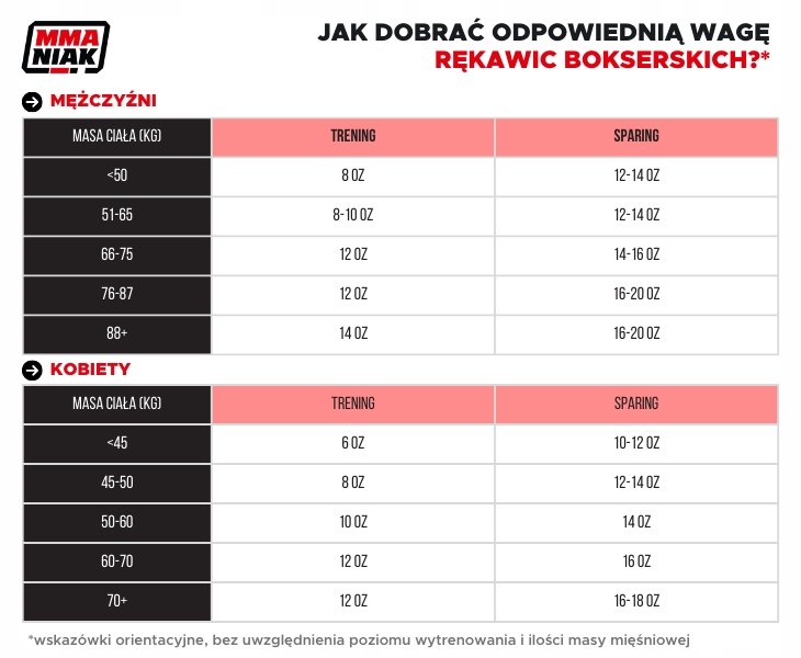 Nie wiesz, jaki wybrać rozmiar rękawic bokserskich dla kobiet, a jaki dla mężczyzn? Dobierz rękawice pod kątem pasującej do Ciebie wagi według wartości z tabeli rozmiarów. Jeśli chcesz przymierzyć rękawice przed zakupem, odwiedź nas w sklepie dla fighterów w Warszawie!