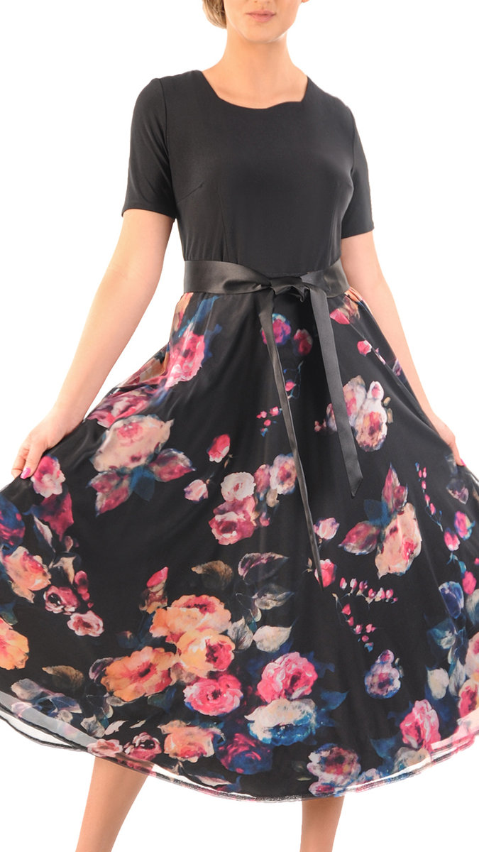 Stylowa sukienka w wrazistym kolorze z orginalym wzorem, to idealna propozycja dla kobiet ceniących połączenie elegancji i komfortu. Góra sukienki wykonana jest z przyjemnej w dotyku dzianiny, która dopasowuje się do sylwetki, natomiast dół z lekkiej tkaniny z motywem liści lub kwiatów w odcieniach amarantowego, zielonego i granatowego dodaje całości dynamiki i oryginalności. Rozkloszowany oraz zwiewny dół nadają sukience lekkości i subtelnie podkreślają figurę. Sukienka posiada ozdobny pasek, który podkreśla talię i dodaje całości eleganckiego charakteru. Krótki rękaw oraz długość midi czynią tę kreację doskonałą na wesela i inne okazje. Materiał jest gładki i matowy, co zapewnia nienaganny wygląd przez cały dzień, tkanina sukienki nie gniecie się. Wybierz tę modną sukienkę jeśli pragniesz wyróżnić się swoim wyjątkowym stylem. Niepowtarzalna kreacja, która łączy nowoczesny wzór z klasyczną elegancją, pozwalając Ci poczuć się pięknie i pewnie na każdej uroczystości.