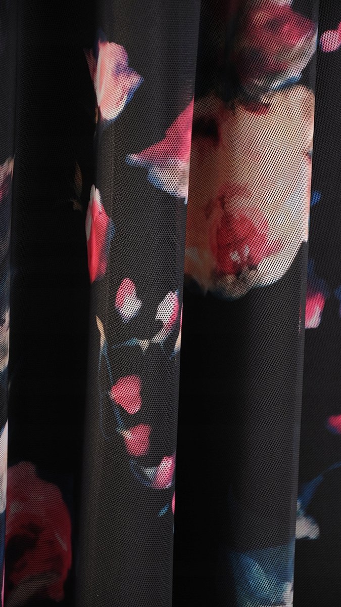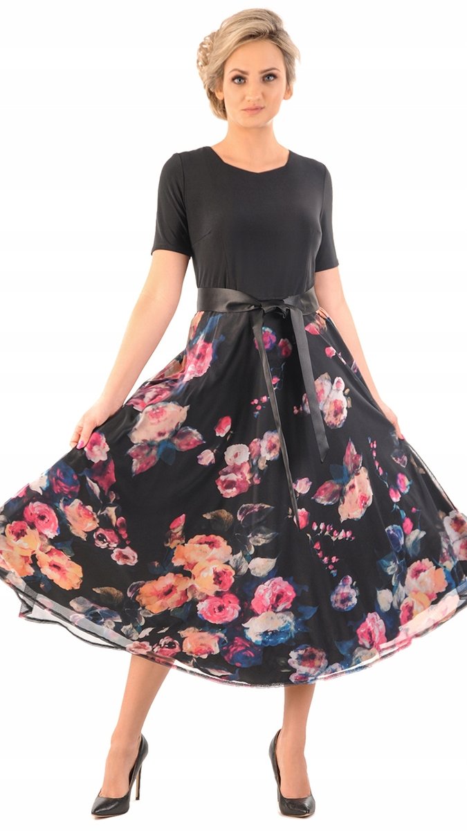 Stylowa sukienka w wrazistym kolorze z orginalym wzorem, to idealna propozycja dla kobiet ceniących połączenie elegancji i komfortu. Góra sukienki wykonana jest z przyjemnej w dotyku dzianiny, która dopasowuje się do sylwetki, natomiast dół z lekkiej tkaniny z motywem liści lub kwiatów w odcieniach amarantowego, zielonego i granatowego dodaje całości dynamiki i oryginalności. Rozkloszowany oraz zwiewny dół nadają sukience lekkości i subtelnie podkreślają figurę. Sukienka posiada ozdobny pasek, który podkreśla talię i dodaje całości eleganckiego charakteru. Krótki rękaw oraz długość midi czynią tę kreację doskonałą na wesela i inne okazje. Materiał jest gładki i matowy, co zapewnia nienaganny wygląd przez cały dzień, tkanina sukienki nie gniecie się. Wybierz tę modną sukienkę jeśli pragniesz wyróżnić się swoim wyjątkowym stylem. Niepowtarzalna kreacja, która łączy nowoczesny wzór z klasyczną elegancją, pozwalając Ci poczuć się pięknie i pewnie na każdej uroczystości.