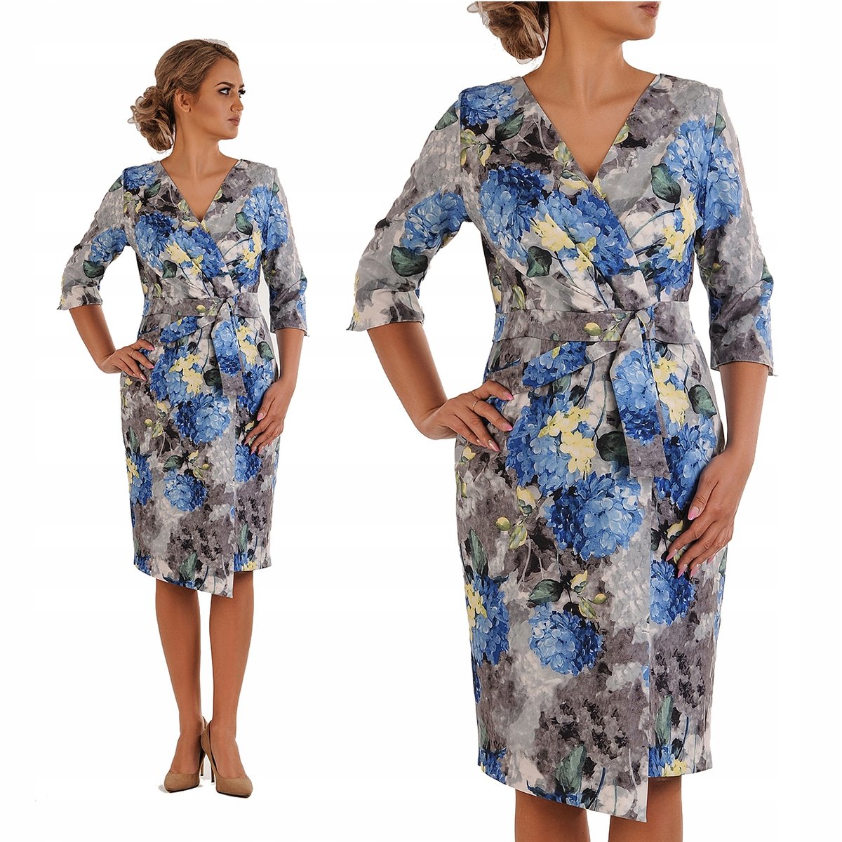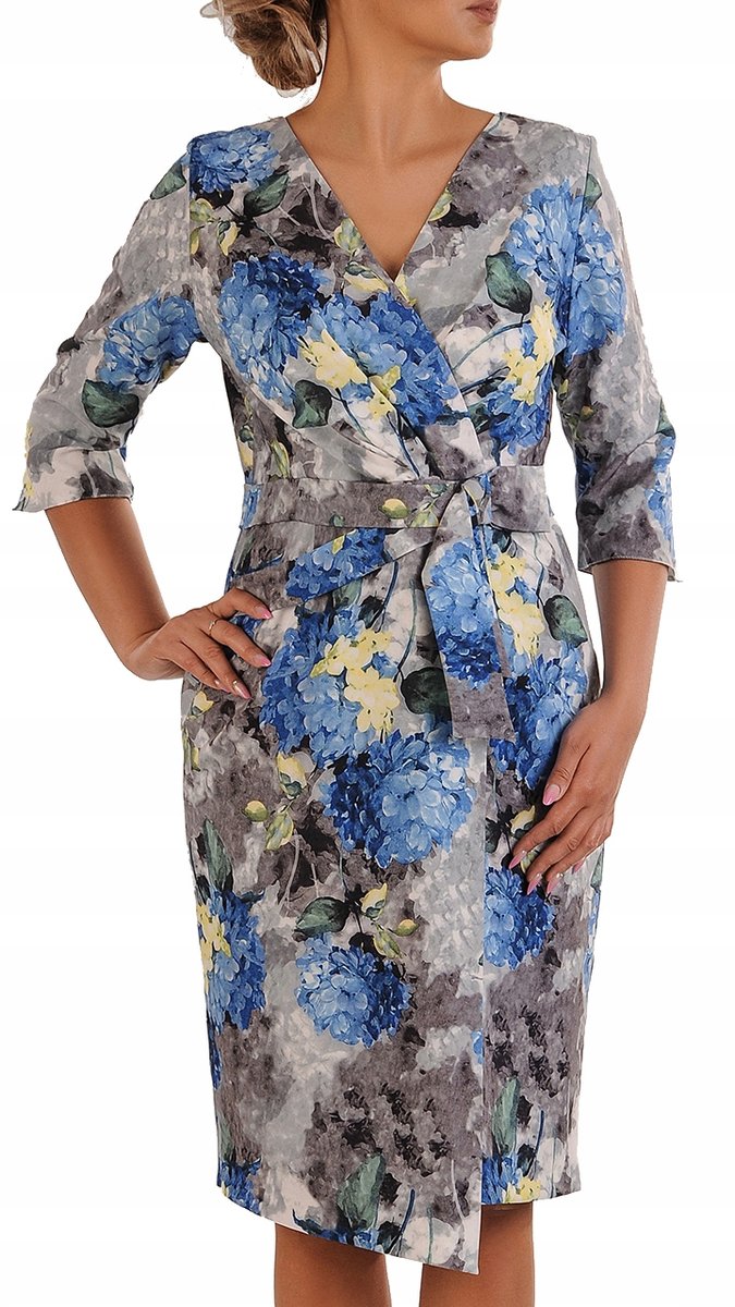 Stwórz niezapomniane wrażenie na każdej uroczystości dzięki tej kwiatowej sukience damskiej, idealnej na wesele czy komunię. Wykonana z przyjemnej w dotyku tkaniny, zapewnia komfort nawet w ciepłe dni. Sukienka prezentuje elegancki kopertowy dekolt i ma prosty fason, który dodaje lekkości i kobiecego uroku. Dodatkowo, przednia zakładka stanowi ozdobny akcent, który przyciąga wzrok. Rękawy 3/4 długości wykonane z tej samej tkaniny wprowadzają lekkość i swobodę, nadając kreacji charakteru. Długość midi do kolan sprawia, że jest to idealna kreacja na różne formalne okazje. Niezależnie od okazji, ta kreacja zawsze zapewni Ci poczucie piękna i komfortu. Bądź gwiazdą każdego wydarzenia w tej wyjątkowej sukience!