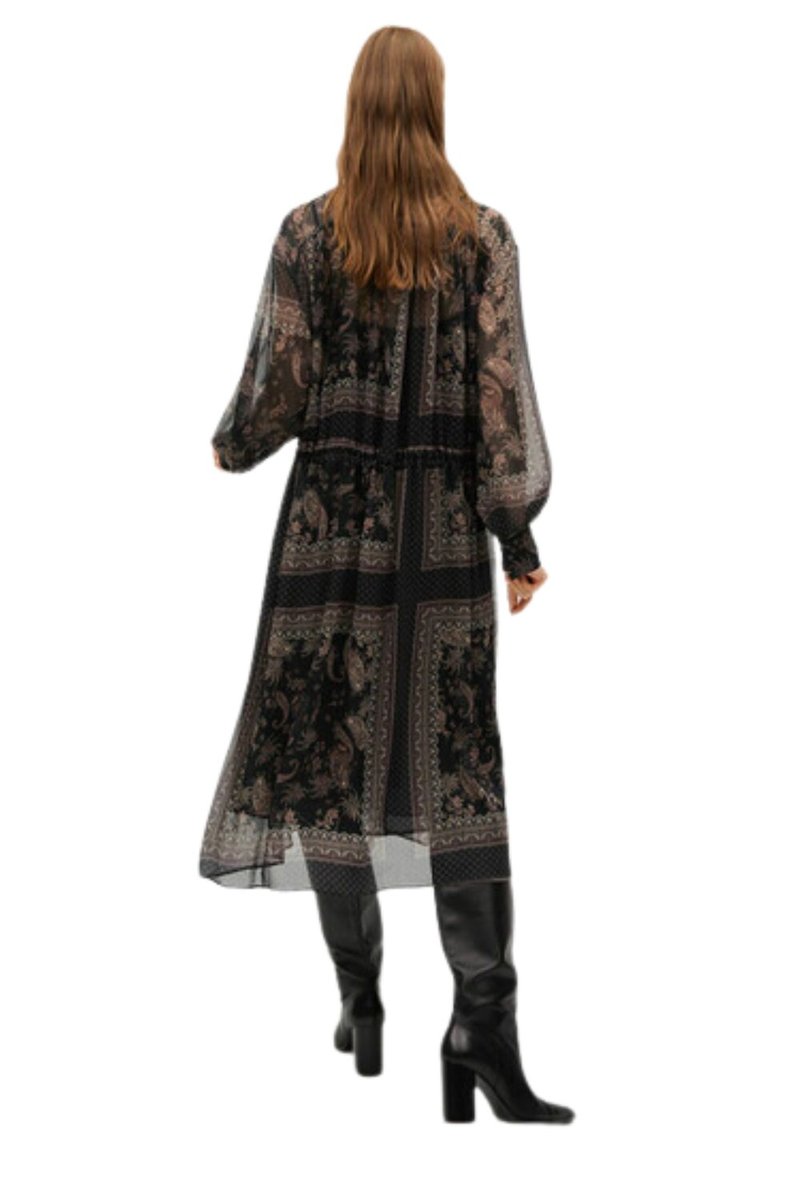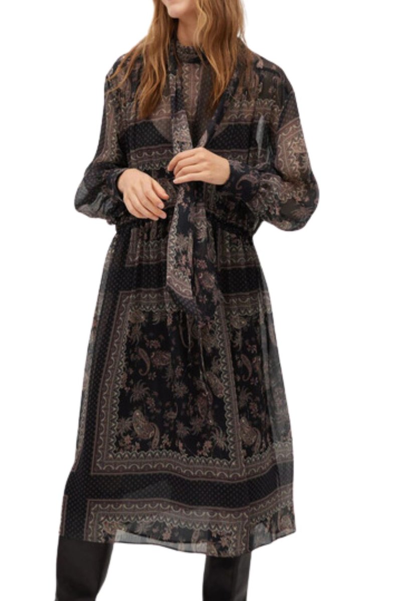 Klasyczna sukienka marki Mango Wykonana z przyjemnego, zwiewnego materiału Długość midi Posiada podszewkę Długi rękaw Dekolt stójka Zapinana guzik na karku Wiązanie w talii WYMIARY Długość ...