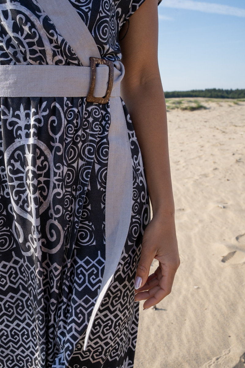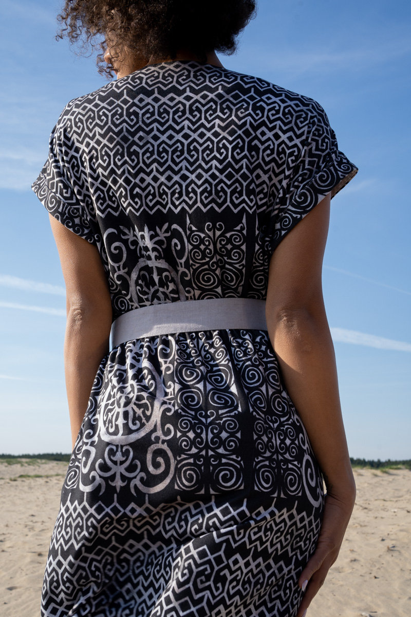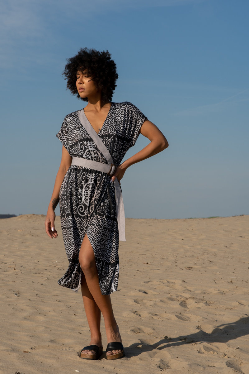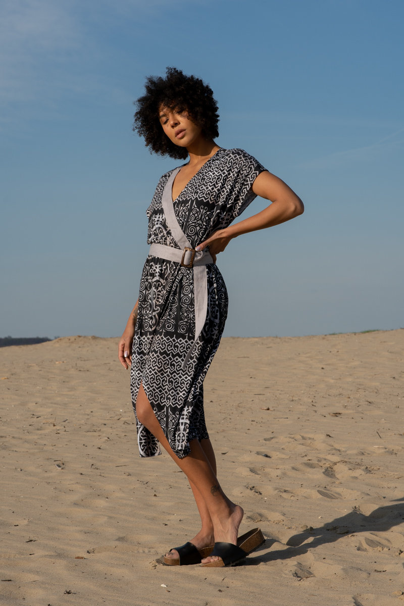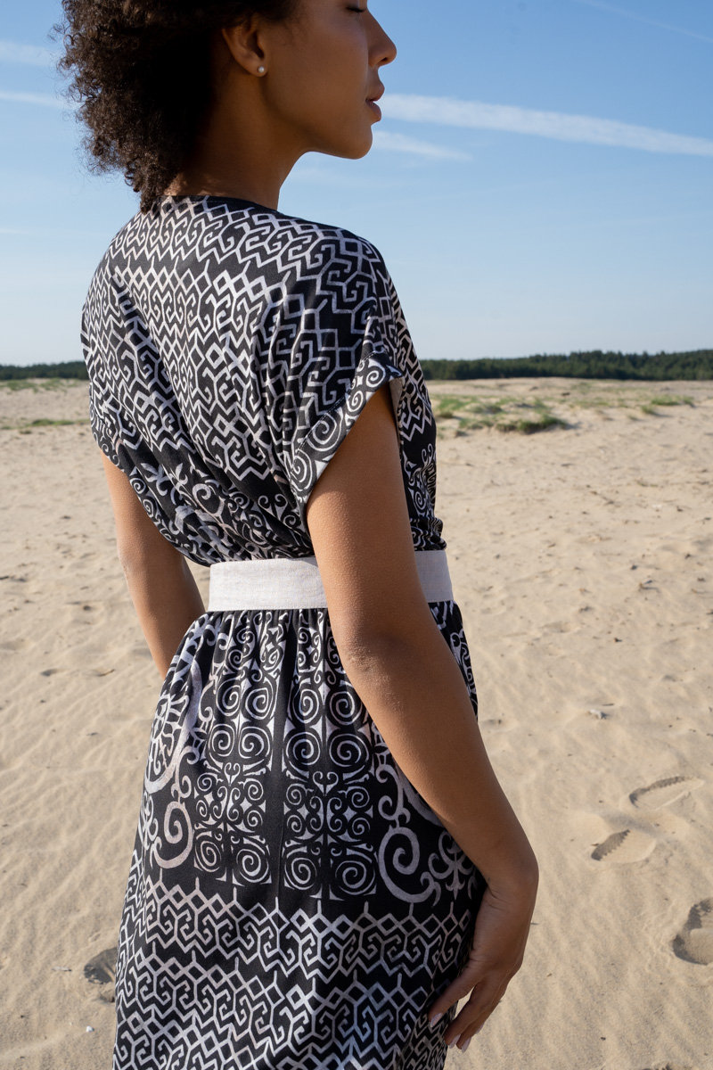 Oguni najbardziej chwaliłyście za formę kimono, jej zwiewność, wygodę, niezobowiązujący, ale kobiecy krój. Taka jest i tym razem. Krótkie, nieco szerokie rękawy, wpisują się w projekt sukienki na lato. Poprowadzona asymetrycznie plisa w kontrastowym odcieniu podkreśla motywy charakterystyczne dla printu. Pasek z klamrą z kokosa, sprawnie zbierze materiał. Latem chcemy Was wyróżnić.