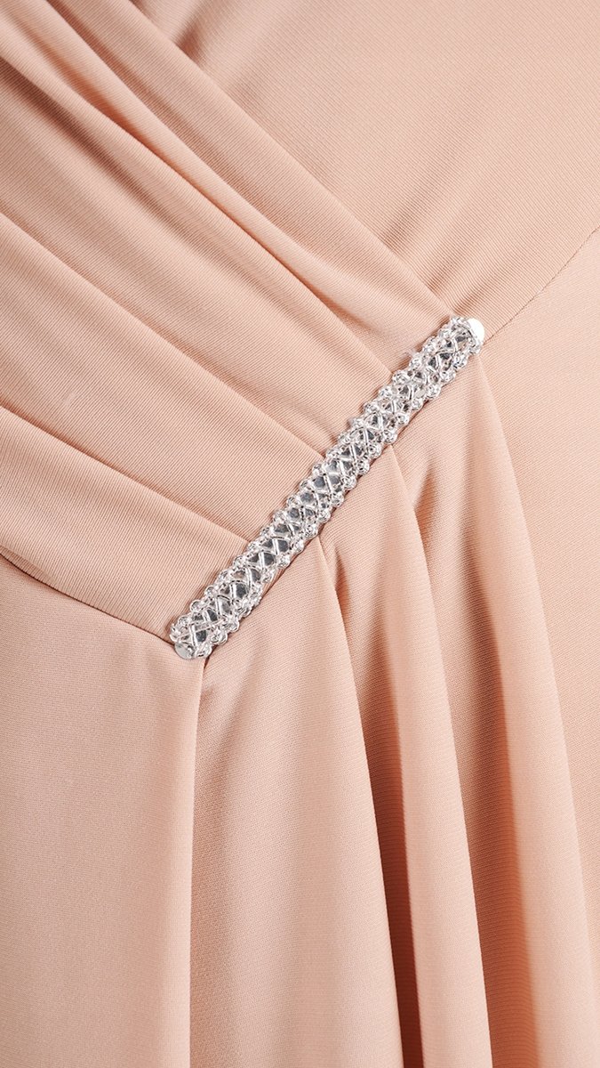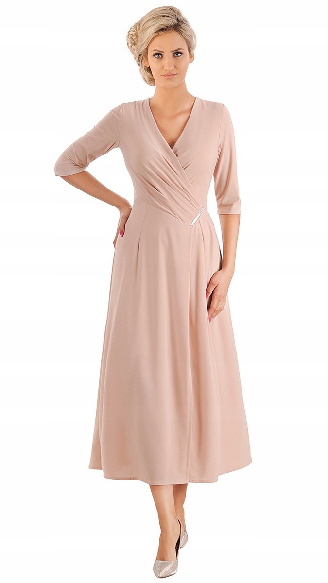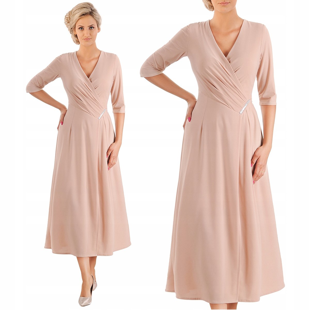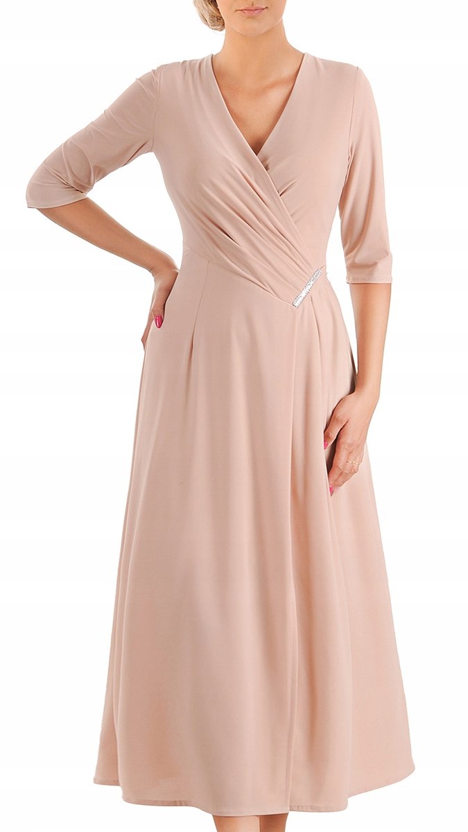 Sukienka wieczorowa w modnym kolorze to kwintesencja elegancji i stylu. Delikatne marszczenia akcentują talię, nadając sylwetce idealne proporcje, a długość maxi wprowadza nutę luksusu i klasy. Sukienka posiada rozcięcie na nodze, które zapewnia swobodę ruchów dodając subtelnej zmysłowości, podkreślając nogi, nadając całości wyjątkowy charakter co sprawia, że stylizacja staje się niepowtarzalna. Kopertowy dekolt w serek subtelnie eksponuje linię szyi i dekoltu, dodając całości kobiecego wdzięku. Ozdobna aplikacja przyciągają wzrok, czyniąc tę kreację idealnym wyborem na wesele, komunię, spotkania rodzinne. Sukienka ma rękawy o długości 3/4, które doskonale balansują pomiędzy elegancją a wygodą. Dodaj tę wyjątkową sukienkę do swojej garderoby i bądź gotowa na każdą okazję.To kreacja, która sprawi, że każdy wieczór stanie się niezapomniany.