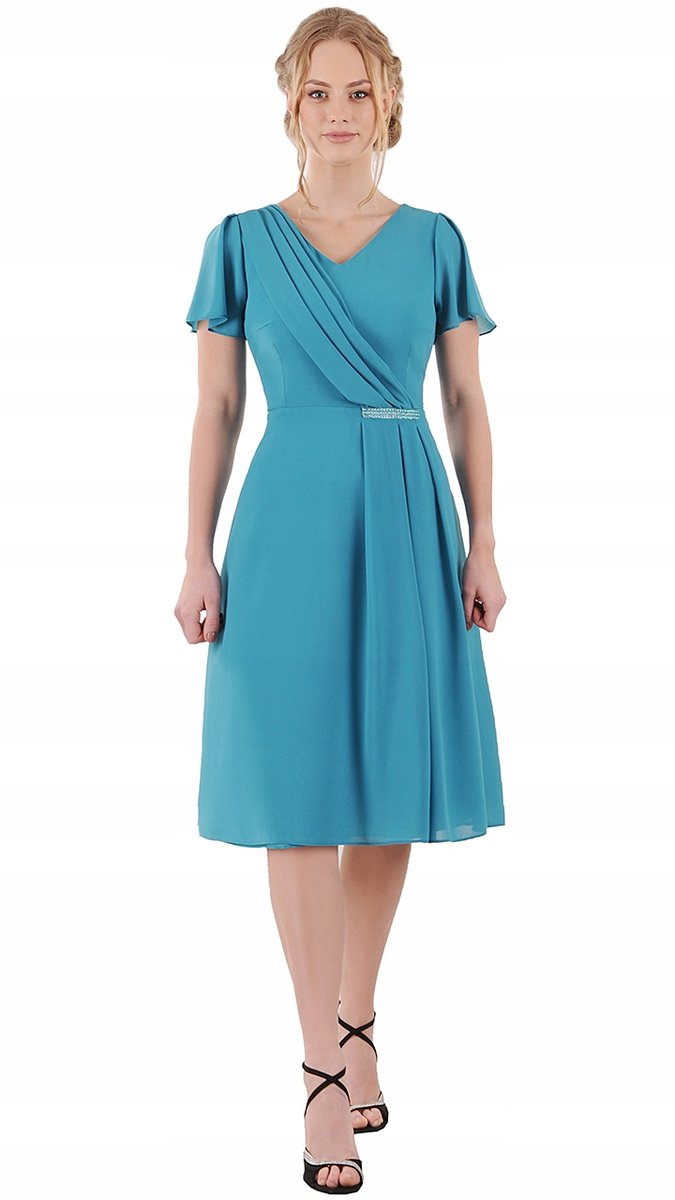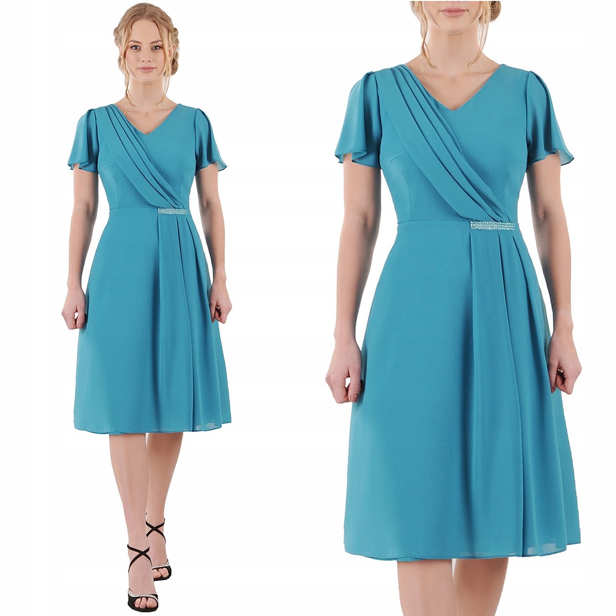 Podkreśl swoją elegancję naszą zwiewną sukienką z szyfonu, idealną na każdą wyjątkową okazję, która podkreśli Twoje kobiece kształty. Ta sukienka o rozkloszowanym fasonie pięknie modeluje sylwetkę, dodając jej lekkości i wdzięku.To kreacja stworzona z myślą o kobietach, które pragną podkreślić swój styl i elegancję podczas wyjątkowych okazji. Krótki rękaw oraz dekolt w serek nadają jej subtelnego uroku, a ozdobna szarfa i ozdobna aplikacja stanowią wyjątkowe akcenty, które przyciągają wzrok. Sukienka ma midi długość do kolan, co sprawia, że jest zarówno wygodna, jak i elegancka, idealnie sprawdzi się w letnie dni, a jej piękny kolor przyciągnie uwagę niejednego przechodnia.Materiał jest przyjemny w dotyku i odporny na zagniecenia, co zapewnia idealny wygląd przez cały wieczór. Jeśli szukasz niepowtarzalnej sukienki, która łączy klasykę z nowoczesnym designem, ta kreacja będzie idealnym wyborem. Dodaj ją do swojej garderoby i przygotuj się na komplementy podczas każdej specjalnej okazji!