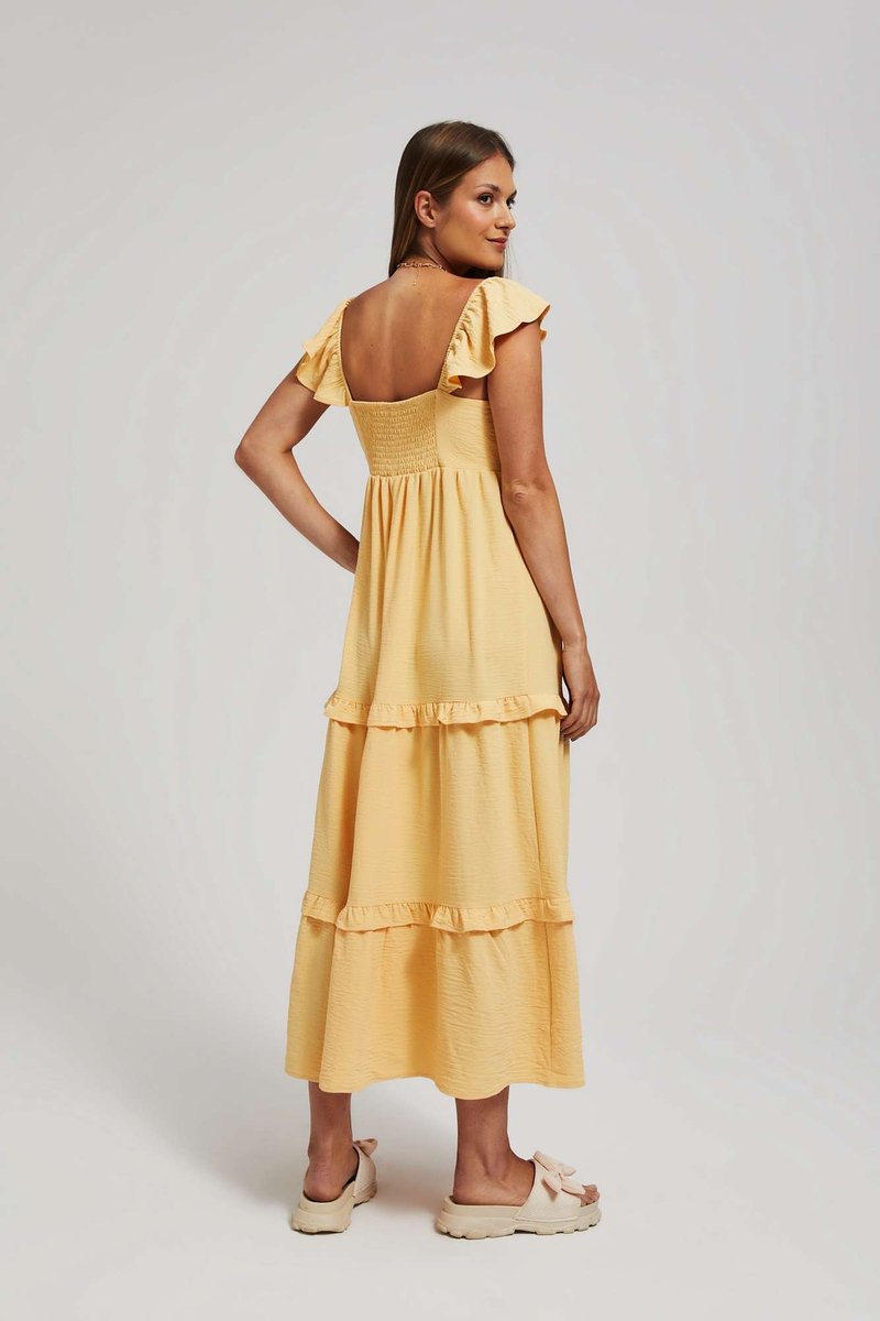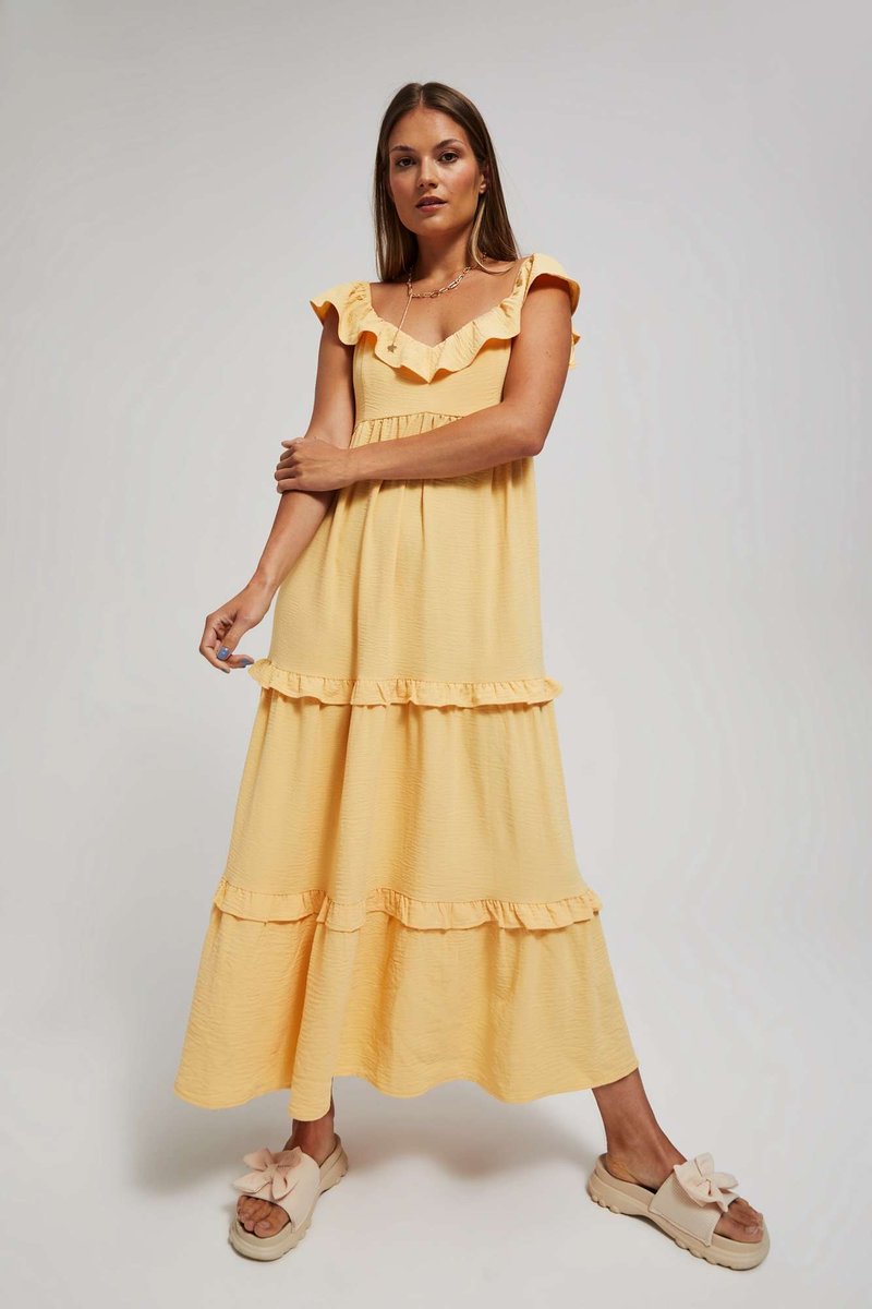 100%POLIESTER Sukienka maxi o pięknym żółtym kolorze. Na całości dwa rzędy falban, które nadają sukience lekkości i uroku. Zwężona w talii. Od pasa w dół jest rozkloszowana, niekrępująca ruchów. Na ...