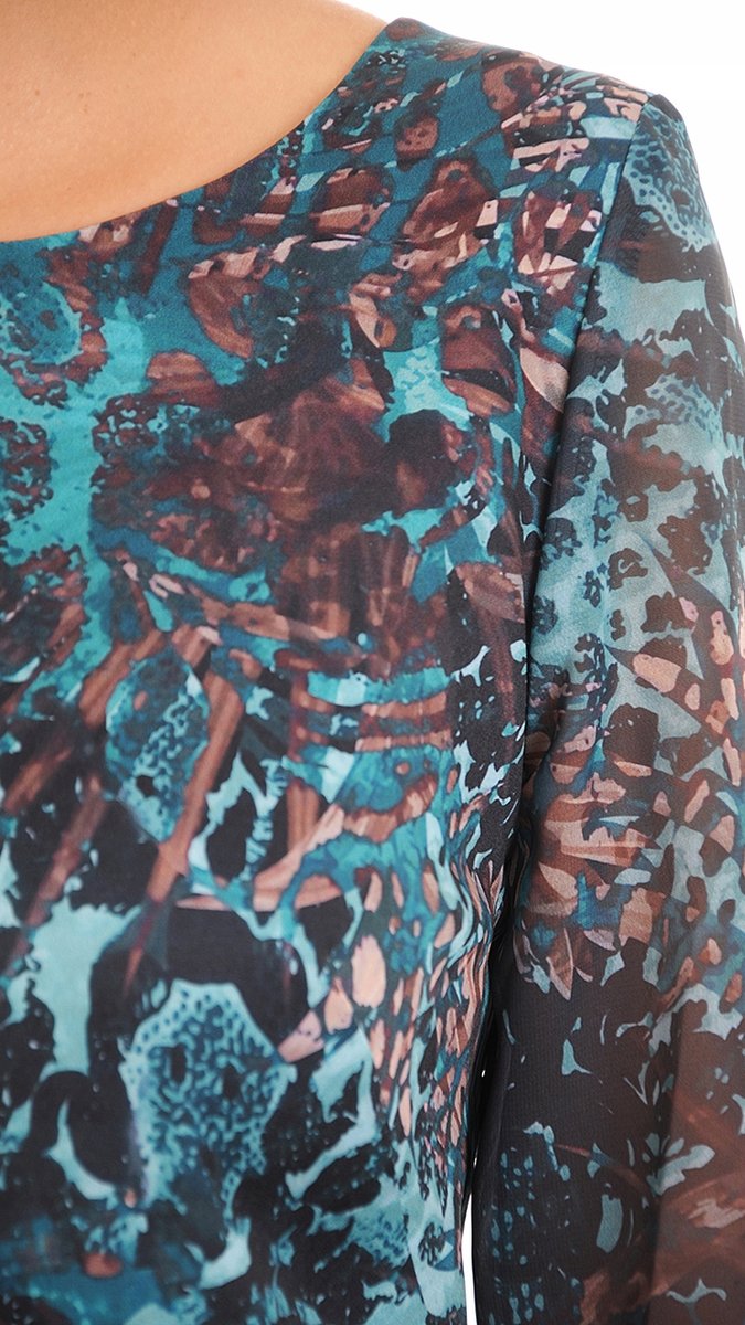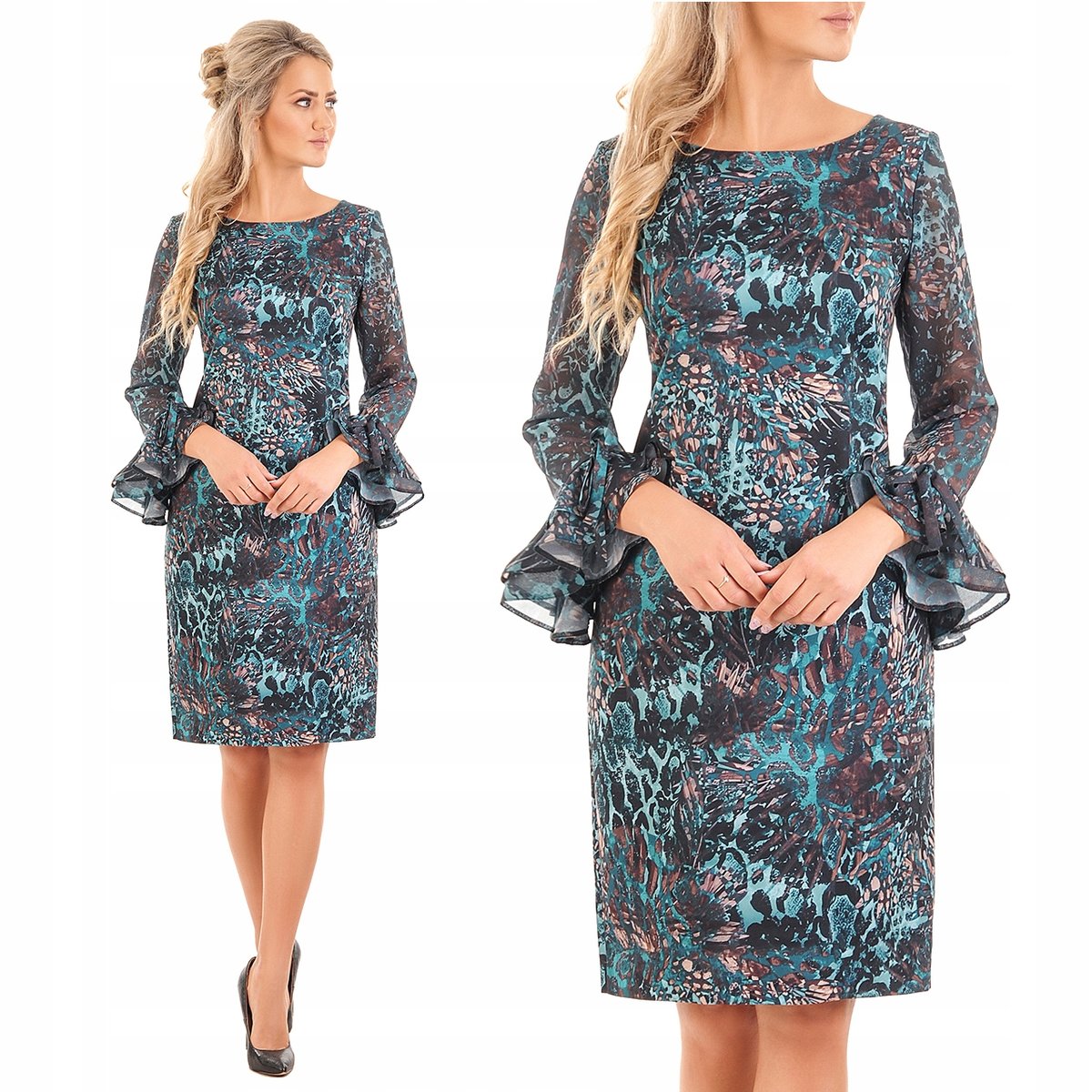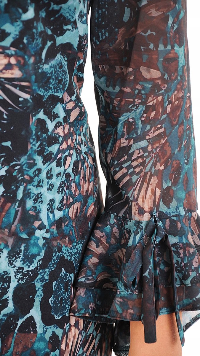 Odkryj romantyczną aurę tej wielokolorowej sukienki. Przyciągający spojrzeniawzór sprawia, że ten prosty fason nabiera niezwykłego wymiaru. Eleganckie ozdobne falbany na długich rękawach wykonanych z szyfonu, dodatkowo zdobione wiązaniami, nadają kreacji lekkości i wyrafinowania. Każdy egzemplarz sukienki, dzięki indywidualnemu układowi wzoru, staje się unikatowym dziełem sztuki mody. Idealna do noszenia na co dzień, jak i na specjalne okazje - wesele, komunia, spotkania rodzinne lub ze znzjomymi. Ta sukienka jest synonimem kobiecej elegancji i wdzięku. Nie czekaj, wprowadź do swojej garderoby odrobinę poezji w postaci tej niezwykłej sukienki.