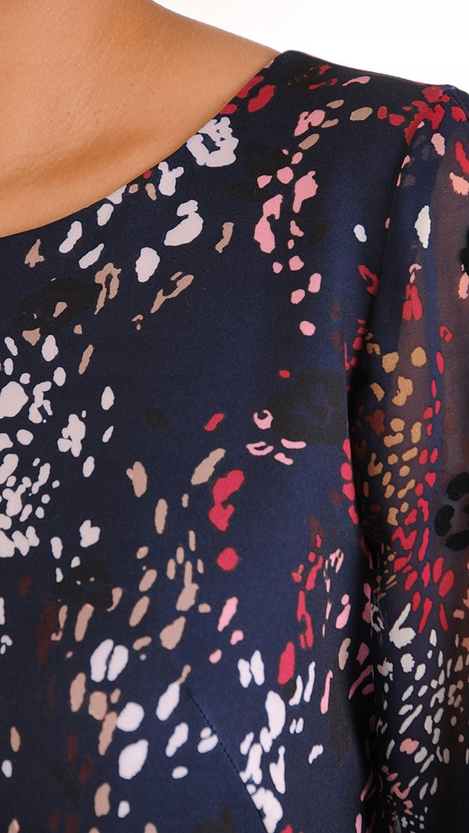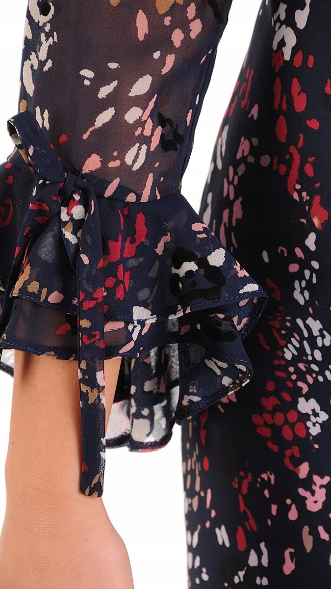 Odkryj romantyczną aurę tej wielokolorowej sukienki. Przyciągający spojrzeniawzór sprawia, że ten prosty fason nabiera niezwykłego wymiaru. Eleganckie ozdobne falbany na długich rękawach wykonanych z szyfonu, dodatkowo zdobione wiązaniami, nadają kreacji lekkości i wyrafinowania. Każdy egzemplarz sukienki, dzięki indywidualnemu układowi wzoru, staje się unikatowym dziełem sztuki mody. Idealna do noszenia na co dzień, jak i na specjalne okazje - wesele, komunia, spotkania rodzinne lub ze znzjomymi. Ta sukienka jest synonimem kobiecej elegancji i wdzięku. Nie czekaj, wprowadź do swojej garderoby odrobinę poezji w postaci tej niezwykłej sukienki.