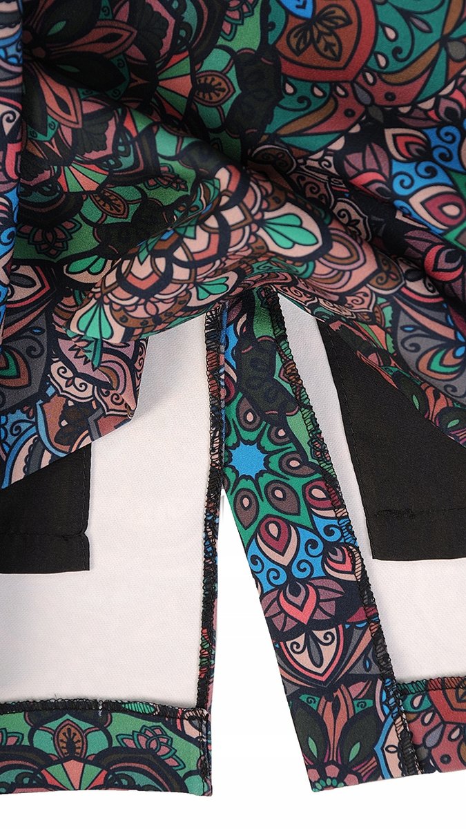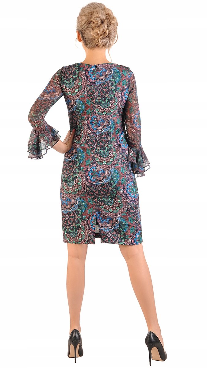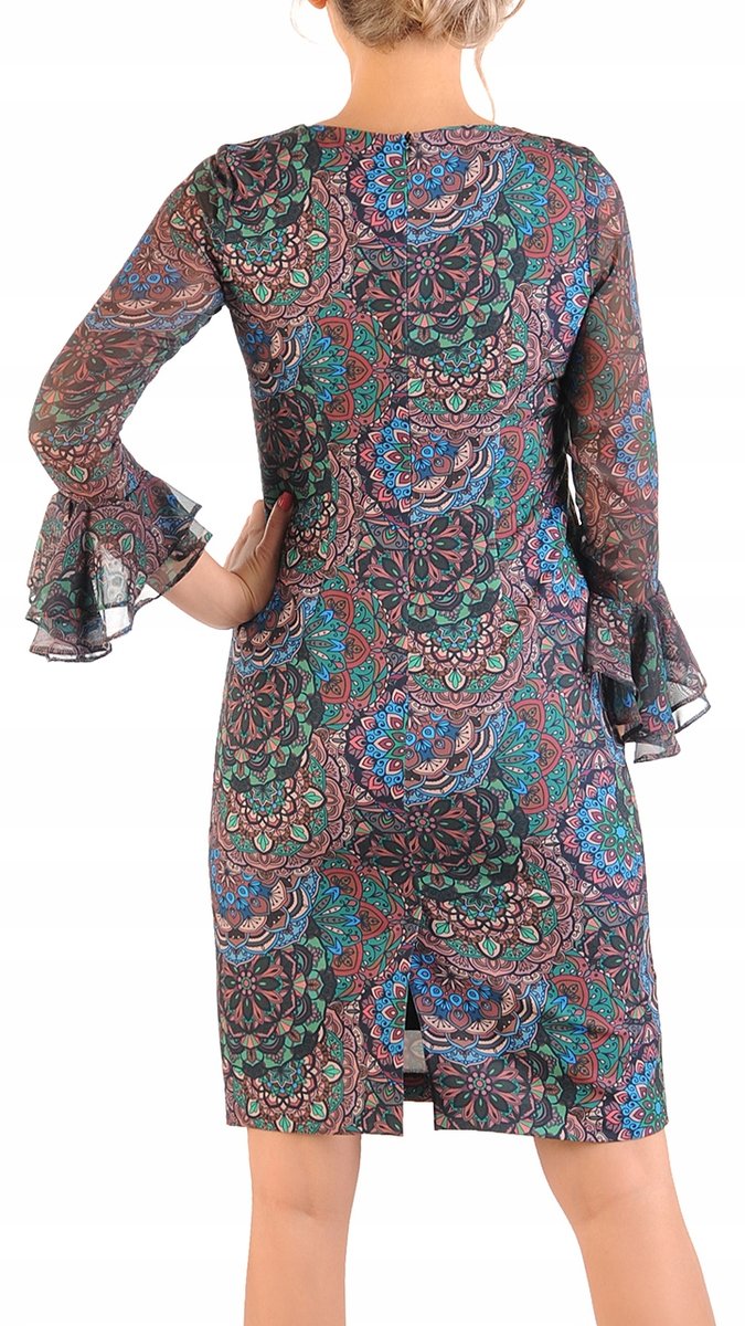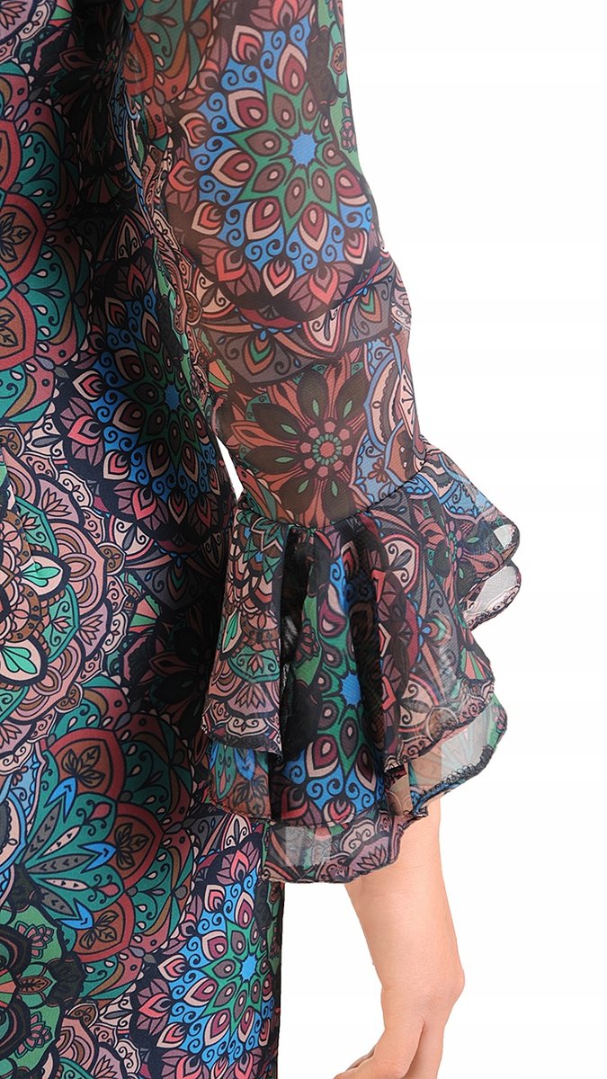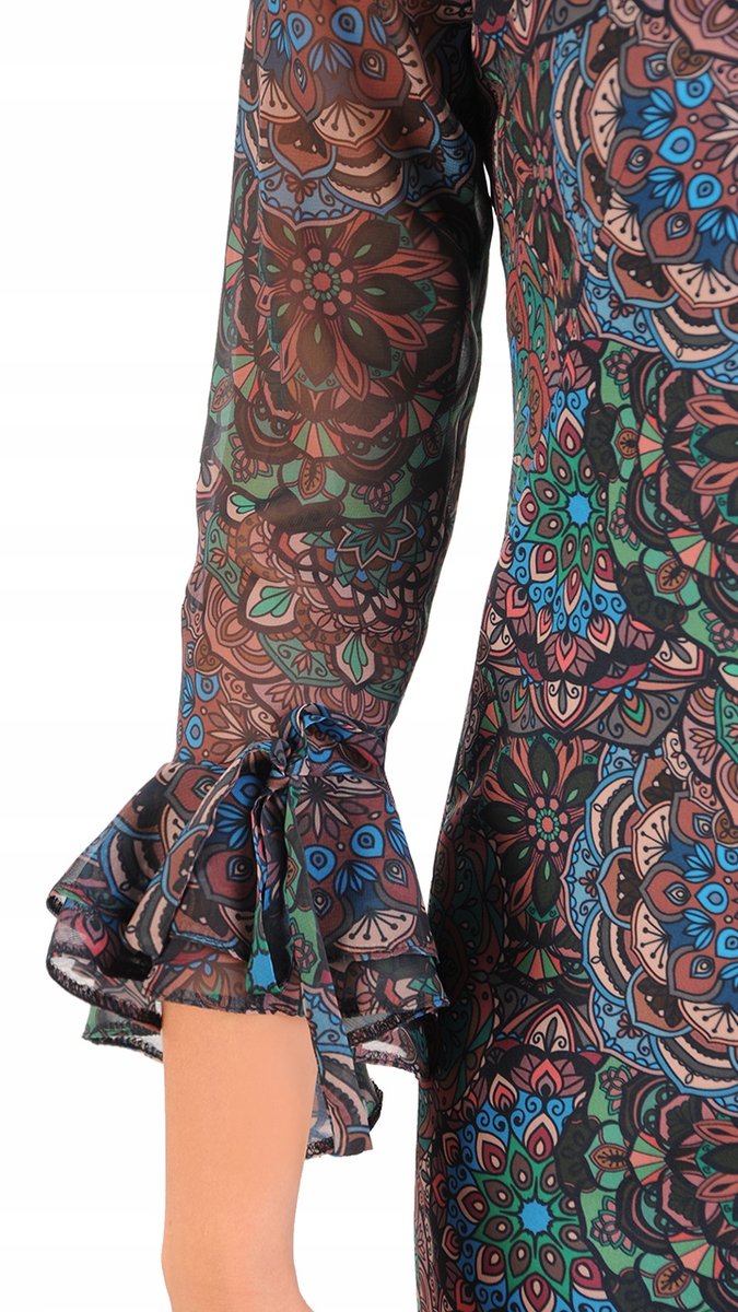 Odkryj romantyczną aurę tej wielokolorowej sukienki. Przyciągający spojrzeniawzór sprawia, że ten prosty fason nabiera niezwykłego wymiaru. Eleganckie ozdobne falbany na długich rękawach wykonanych z szyfonu, dodatkowo zdobione wiązaniami, nadają kreacji lekkości i wyrafinowania. Każdy egzemplarz sukienki, dzięki indywidualnemu układowi wzoru, staje się unikatowym dziełem sztuki mody. Idealna do noszenia na co dzień, jak i na specjalne okazje - wesele, komunia, spotkania rodzinne lub ze znzjomymi. Ta sukienka jest synonimem kobiecej elegancji i wdzięku. Nie czekaj, wprowadź do swojej garderoby odrobinę poezji w postaci tej niezwykłej sukienki.