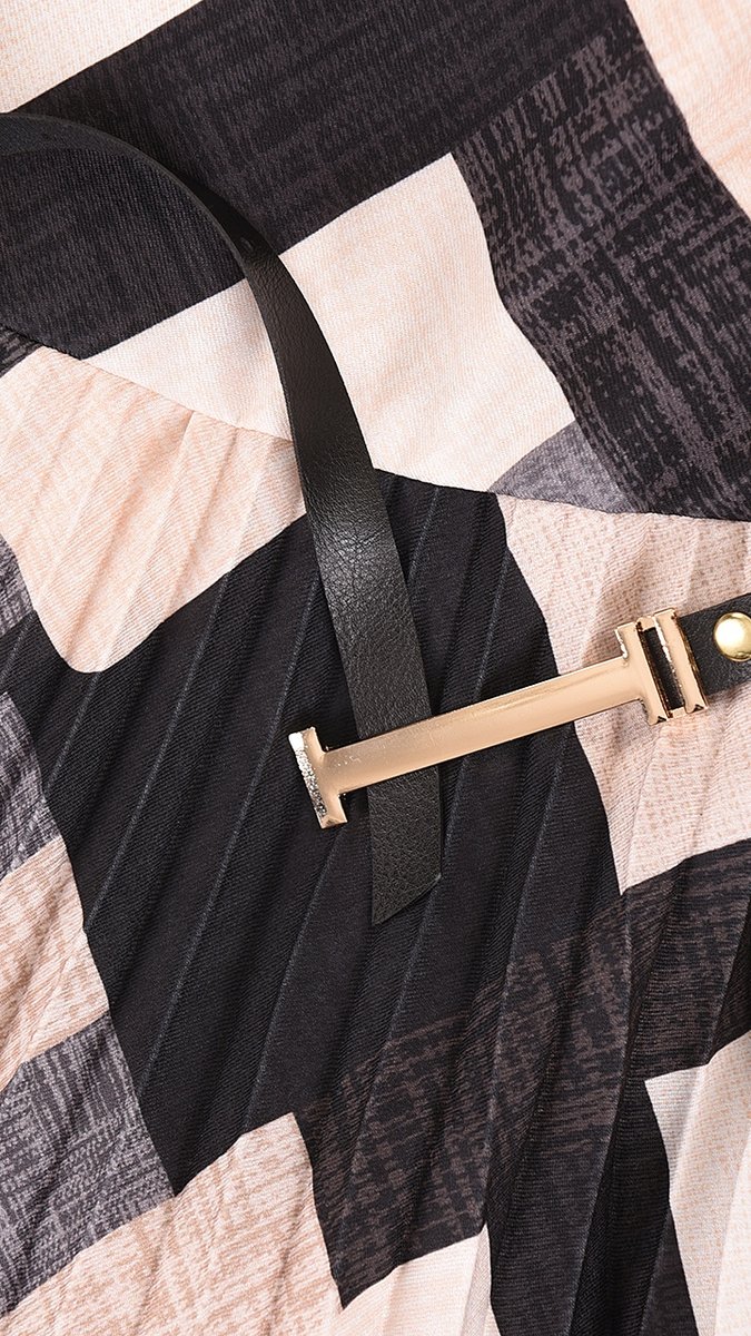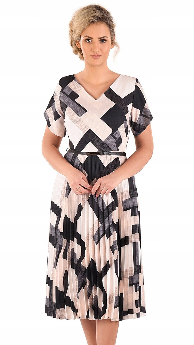 Stylowa sukienka midi o rozkloszowanym fasonie to propozycja dla kobiet ceniących subtelną elegancję i ponadczasowy styl. Wyrafinowana kolorystyka tworzy harmonijną kompozycję, idealną na każdą wyjątkową okazję. Plisowany dół sukienki subtelnie podkreśla talię i zapewnia niezwykłą swobodę ruchów, dzięki czemu kreacja świetnie sprawdzi się zarówno na formalne okazje, jak i spotkania towarzyskie, to doskonały wybór dla kobiet lubiących wyróżniać się z tłumu. Kreacja zachwyca elegancją i stylem, a krótki rękaw sprawia, że jest to idealny wybór na ciepłe dni. Uroku dodają plisy, nadające sukience dynamiki oraz elegancki pasek w delikatnym odcieniu sukienki subtelnie podkreślający talię, nadając figurze smukłych proporcji. Dzięki długości midi do łydek, sukienka idealnie nadaje się na przyjęcia, uroczystości rodzinne czy wieczorne wyjścia. Długość kreacji oraz krótkie rękawy sprawiają, że sukienka jest niezwykle komfortowa i elegancka, dekolt w serek pięknie eksponuje szyję. Podkreśl swoją kobiecość i wyróżnij się na każdym wydarzeniu w tej stylowej kreacji.