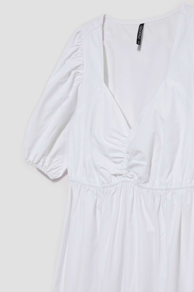 60%POLIESTER, 40%BAWEŁNA Sukienka w białym kolorze, gładki materiał, bez wzorów. Dekolt w serek. Bufiaste rękawy do łokcia, zakończone ściągaczem. Podkreślona talia, nadaje kształt sylwetce. Dół ...
