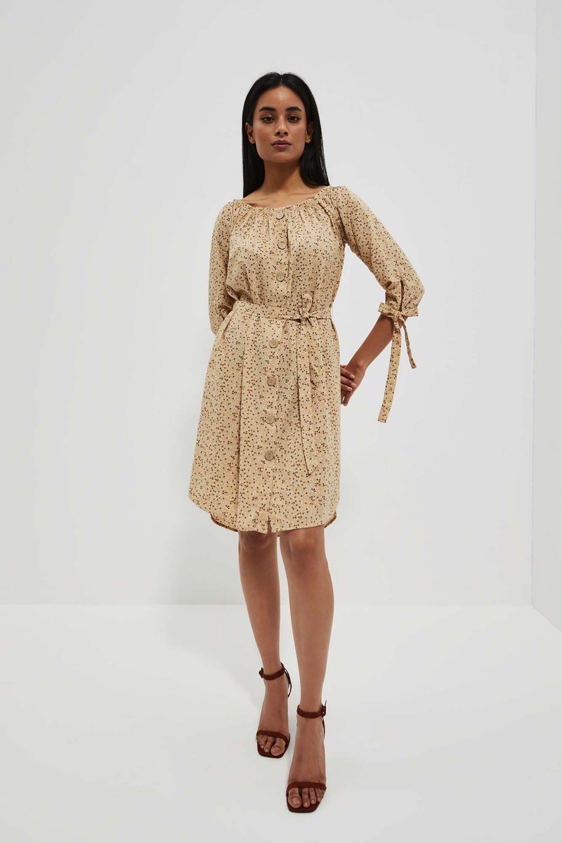 100%POLIESTER Krótka sukienka z łódkowym dekoltem typu hiszpanka. Jasny beżowy kolor, na całości nadruk drobnych kropek. Krój prosty. W pasie przewiązana materiałowym paskiem. Rękawy długości 7/8, z wiązaniem przy mankiecie. Całość zapinana na duże, drewniane guziki. Długość przed kolano. Tył sukienki nieco dłuższy z zaokrągloną krawędzią. Wykonana z przyjemnego i zwiewnego materiału. Świetny model na co dzień do pracy, na letni spacer lub wakacyjne wyjazdy.