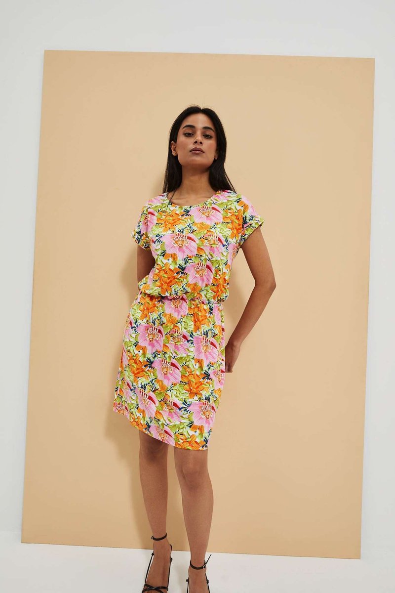 92%POLIESTER, 8%ELASTAN Wzorzysta sukienka, na całości ozdobiona wzorem dużych kwiatów w kolorze różowym i pomarańczowym. Okrągły dekolt. Luźne i krótkie rękawy, delikatnie wywinięte na brzegu. W talii guma, podkreślająca i nadająca kształt. Luźny i niekrępujący ruchów fason. Świetnie sprawdzi się na co dzień oraz do pracy. Propozycja na kobiet lubiących się wyróżniać.